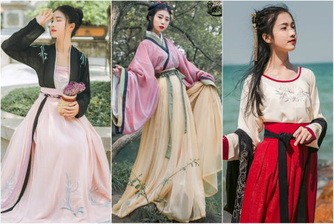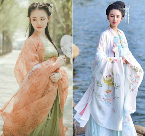 - Ruqun/襦裙 - the most basic type of hanfu consisting of a top and a wrap-around skirt. The top is called “ru/襦” and the skirt is called “qun/ 裙”, hence “ruqun”. Sleeves can be narrow or wide. Generally speaking, people divide ruqun into two types based on the height of the skirt: “Qiyao Ruqun/ 齐腰襦裙” (waist-high ruqun) and “Qixiong Ruqun/ 齐胸襦裙” (chest-high ruqun).