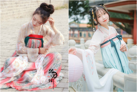As seen in the photos above, ruqun is often accessorized with a long scarf called Pibo/披帛. Originally used to protect against wind and cold air, pibo gradually became an important feature of hanfu.