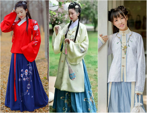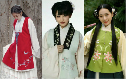Banbi/半臂 - a half-sleeve jacket worn by both men and women. It comes in various lengths and is usually worn over ruqun. Its collar can be parallel (left), crossed (middle), or u-shaped (right). When paired with ruqun, it can be worn tucked inside the skirt as well as over the skirt (untucked).