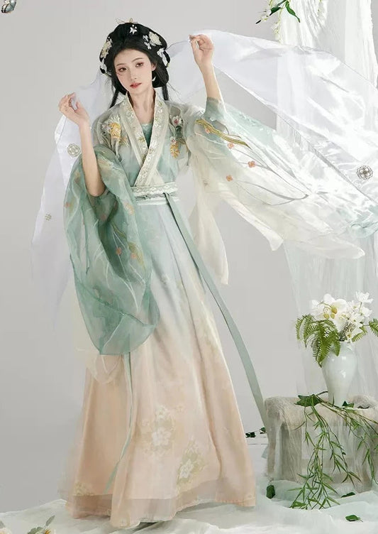 オリジナル漢服 4 点セット: 甦る戦国時代の華麗さ - 精緻な刺繍が施された春夏向けの絶妙な仕立てのローブドレス