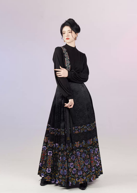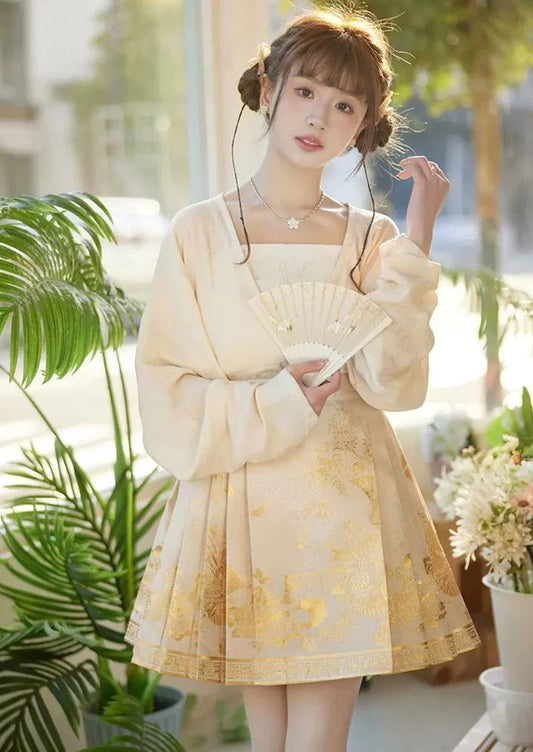 馬面スカート2点 絶妙な明代漢服セット:刺繍スタンドカラートップと金色の馬面スカート - 2024年新コレクション