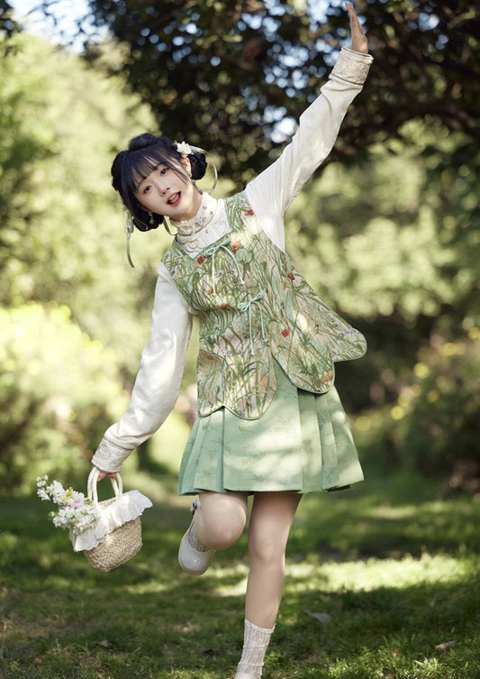 エレガントでモダンな中国の漢服4点セット:刺繍模様のグリーンのベストと短い馬の顔のスカート - 春の普段着に最適