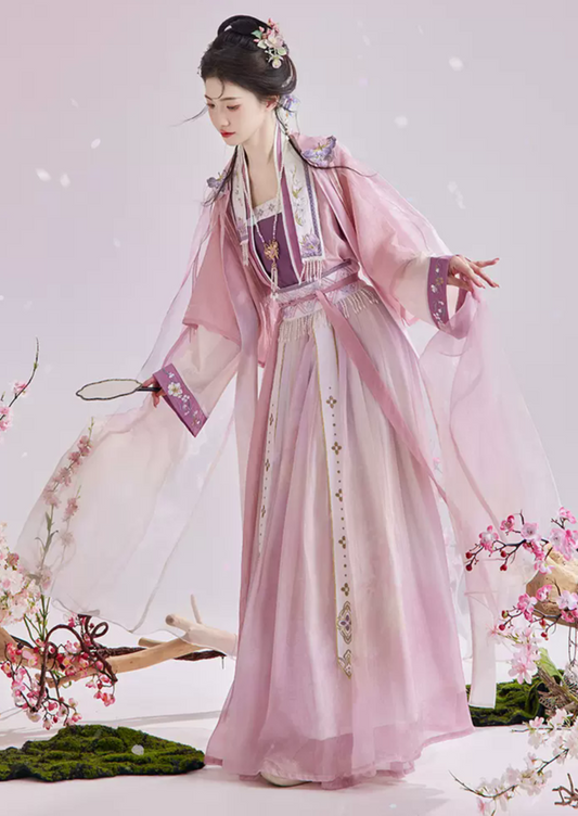 6 ピースのオリジナル漢服: 南北朝時代にインスピレーションを得た、特大の袖とウエストバンドを備えたアンサンブル。春に向けた複雑な刺繍が特徴です。