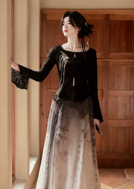 エレガントでモダンな中国の漢服アンサンブル 2 点: 女性用の改良された馬の顔のスカート セット - 2024 年春夏の普段着や通勤に最適