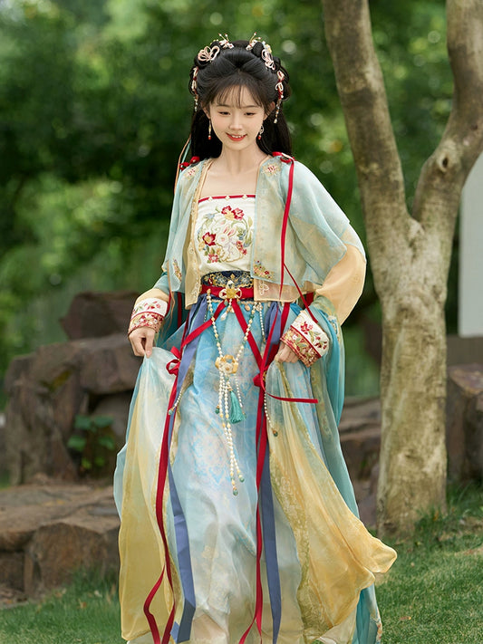 明朝風の漢服アンサンブル: メイクアップモチーフのユニセックス花柄刺繍ローブ