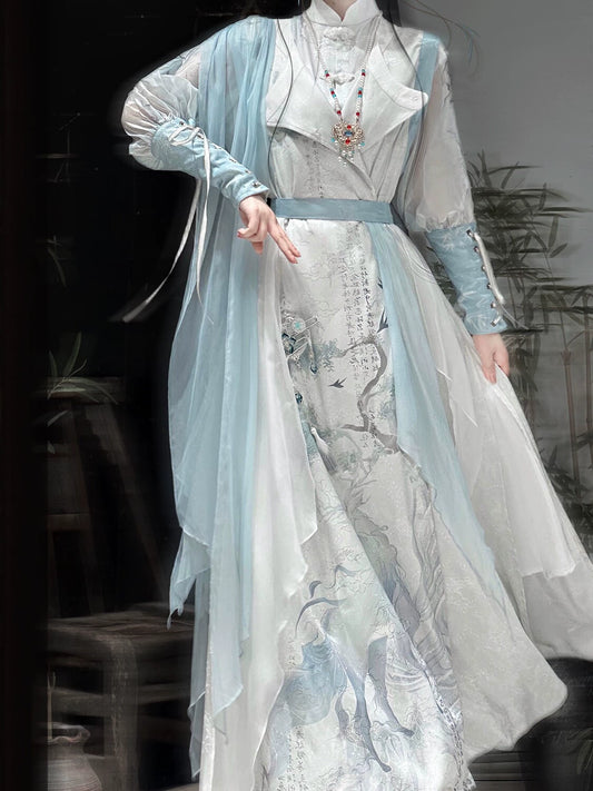 Flower Poetry Ink Painting Improved Crew Neck Dress Hanfu Tang Style