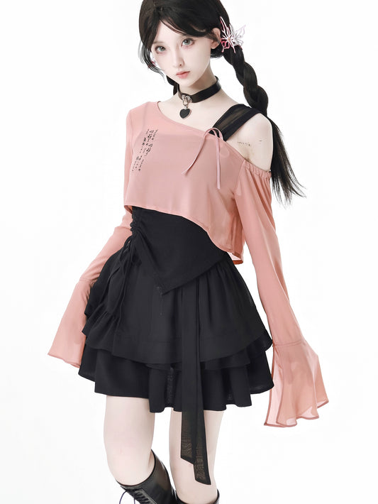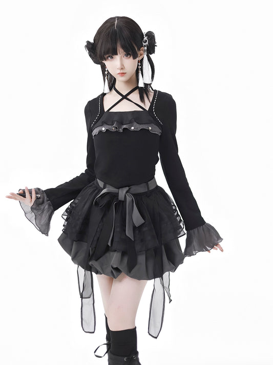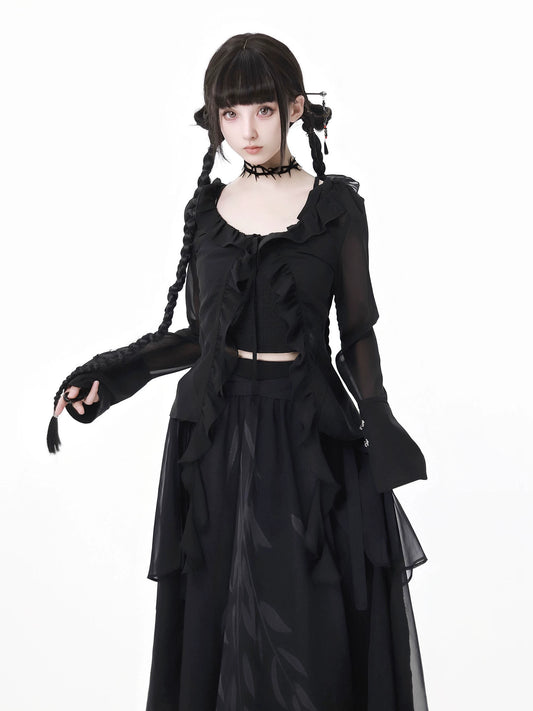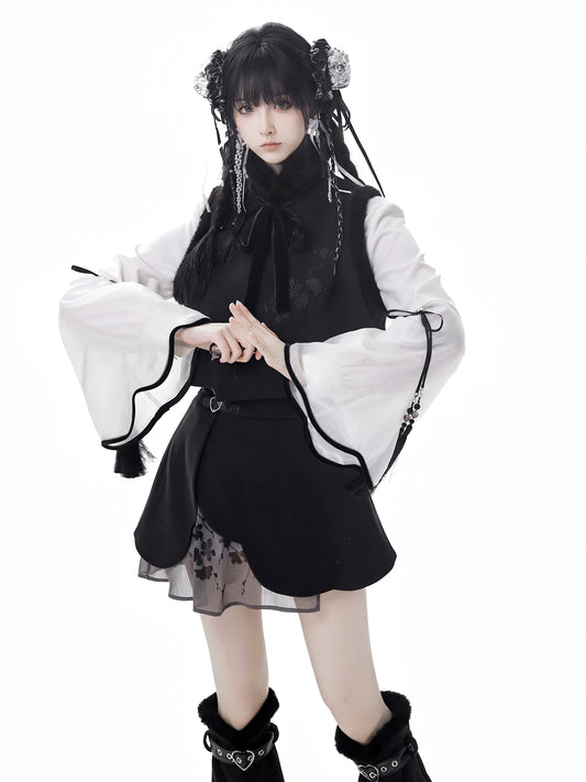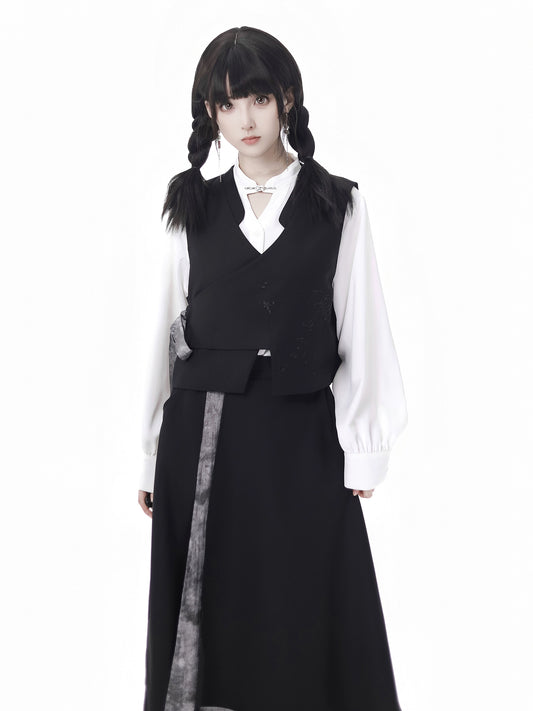 New Chinese Style Mix Slim Skirt Black Salt Suit