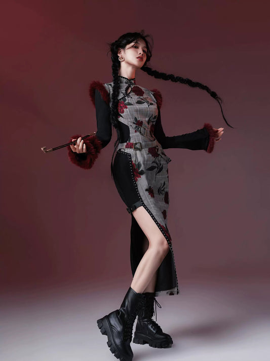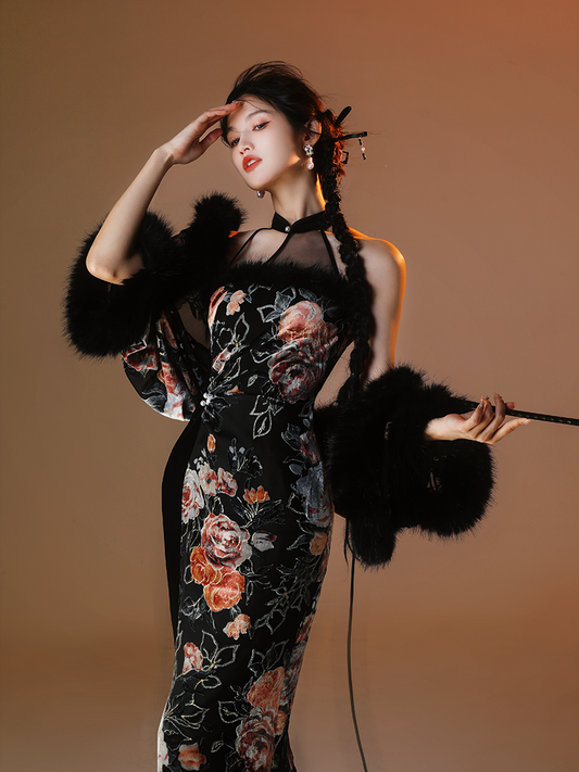 New Chinese Style Velvet Silk Cheongsam Qipao Roses Guns