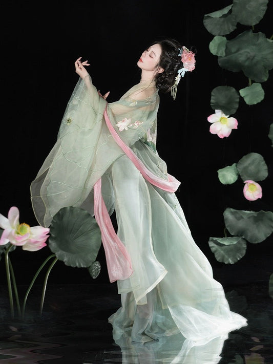 優美なロータス漢服アンサンブル: 2024 年春夏の刺繍入りヘジ スカート、ワイド スリーブ シャツ、エプロン、ショール