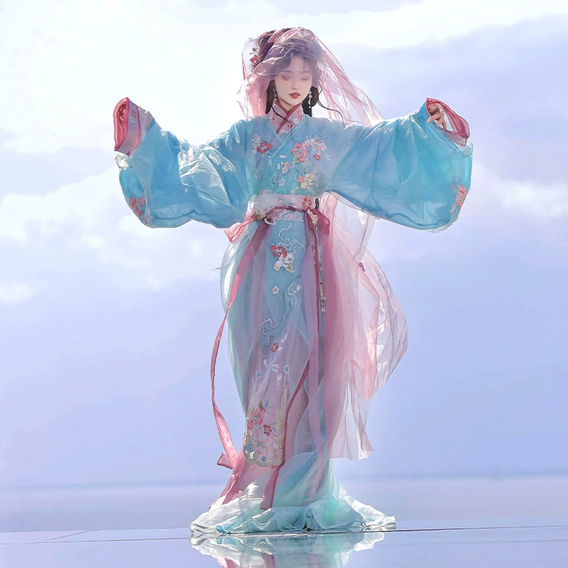 Underskirt: Upper Underskirt And Lower Skirt, Leading To The Right Collar. As The Main Form Of Hanfu, The Details Of The Underskirt Have Been Changing. Some Have A Deep Cross-Collar To The Armpits, Very Wide Sleeve Edges, The Base Of The Sleeves Is Wider Than The Cuffs, And A Waistline; Some Have A Shallow Cross-Collar, With The Base Of The Sleeves And The Width Of The Cuffs Being The Same. , Straight Sleeves With Narrow Sleeve Edges. In Addition, There Are Chest-Length Underskirts, Which Are A Style Of Underskirts Based On The Position Of The Tie. The Skirt And Lace Are Tied Above The Chest. The Hem Is Drooping And Elegant. It Can Be Divided Into Double-Breasted And Cross-Collared Styles, With The Majority Of The Skirts Being Double-Breasted.