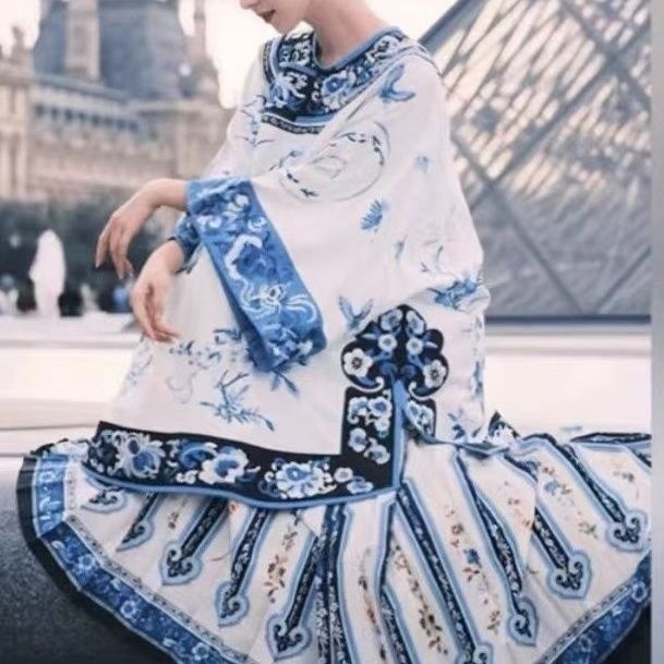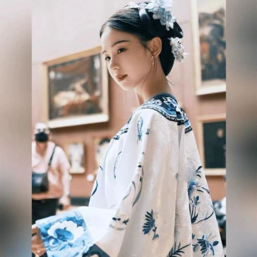 Classical Qing Dynasty Han Women Hanfu Blue and White Porcelain Cloak