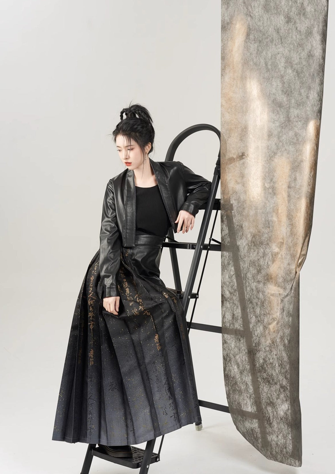 修正されたベルスリーブのデザインとパッチワークの馬の顔のハーフスカートを組み合わせた、漢服にインスピレーションを得たオリジナルのレザージャケットで、伝統と現代性の融合を楽しんでください。このユニークなアンサンブルは、伝統的な中国のファッションを現代のウェアに合わせて再解釈したものです。