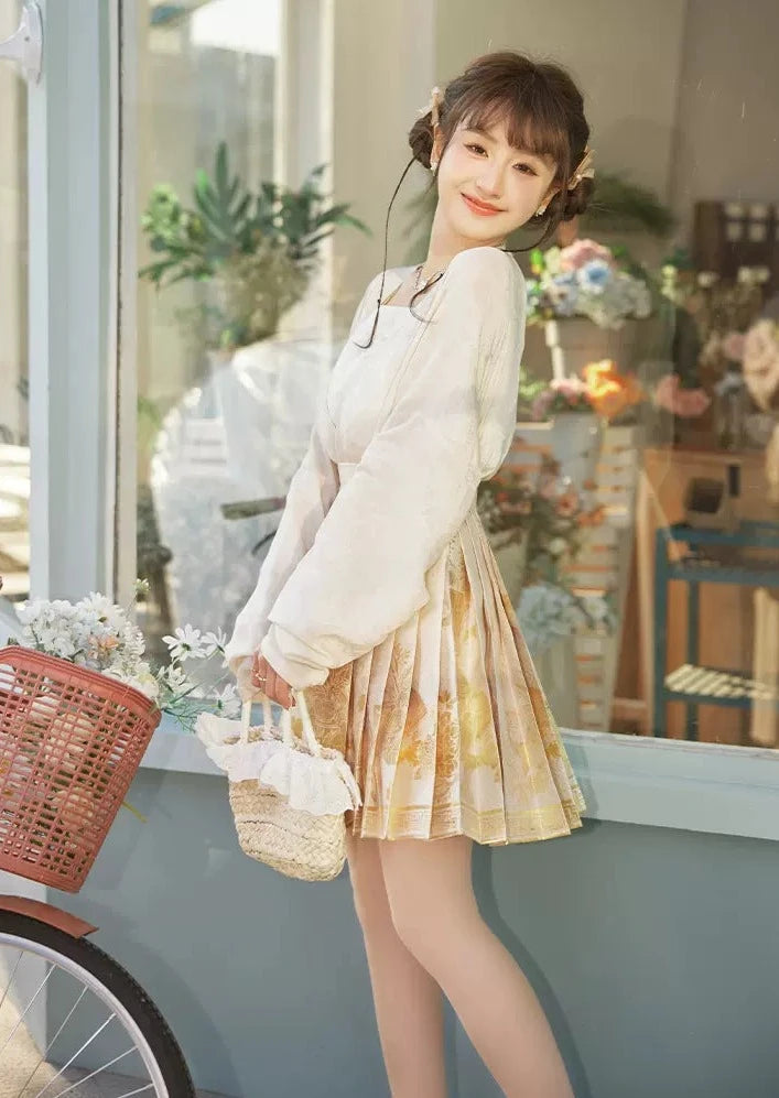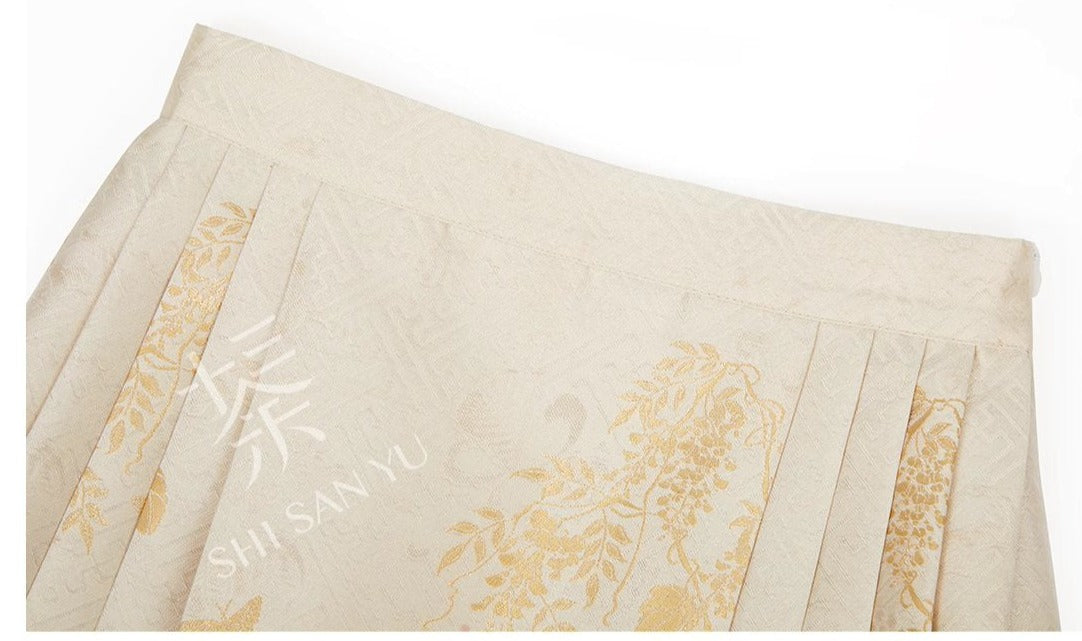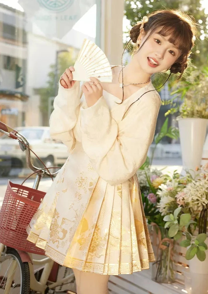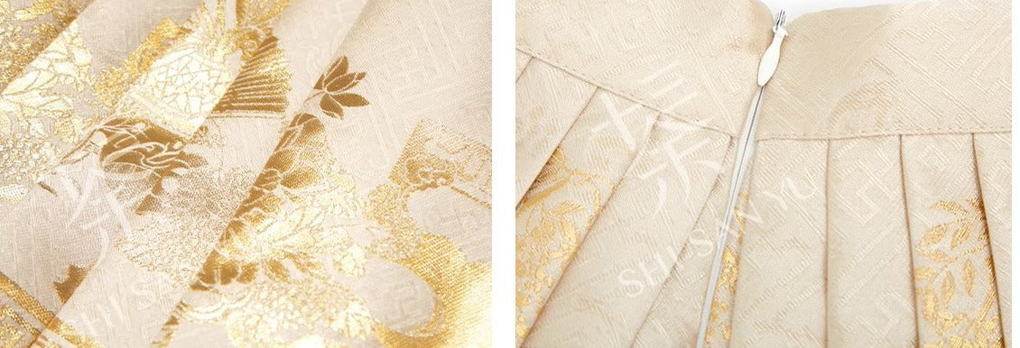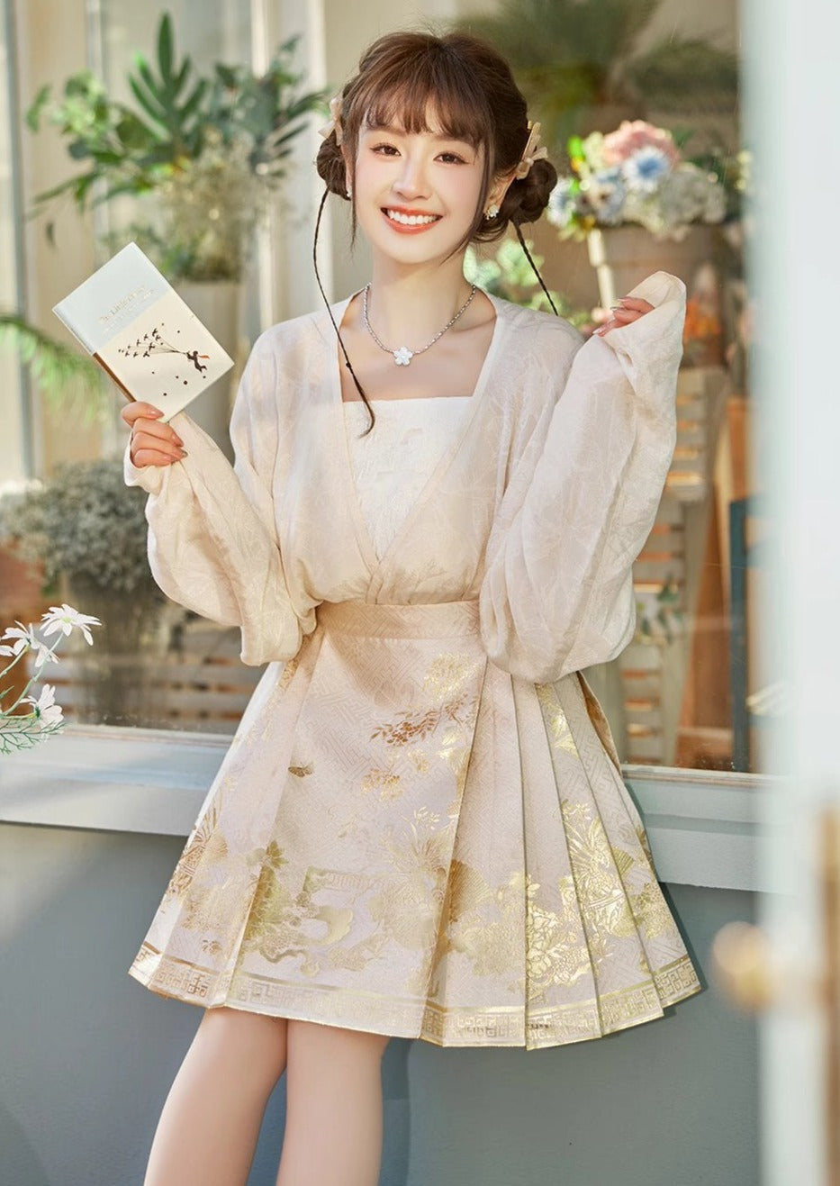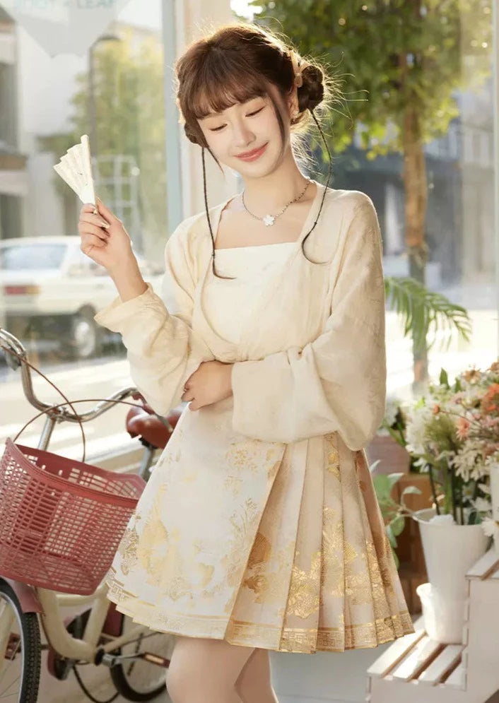 シックでモダンな中国の漢服 3 ピース: 金色の織りが施された短い馬の顔のスカート - 女性のための多用途の日常着