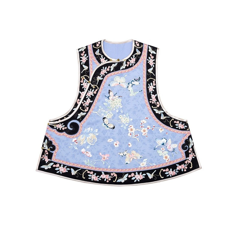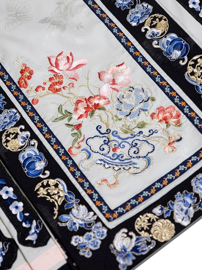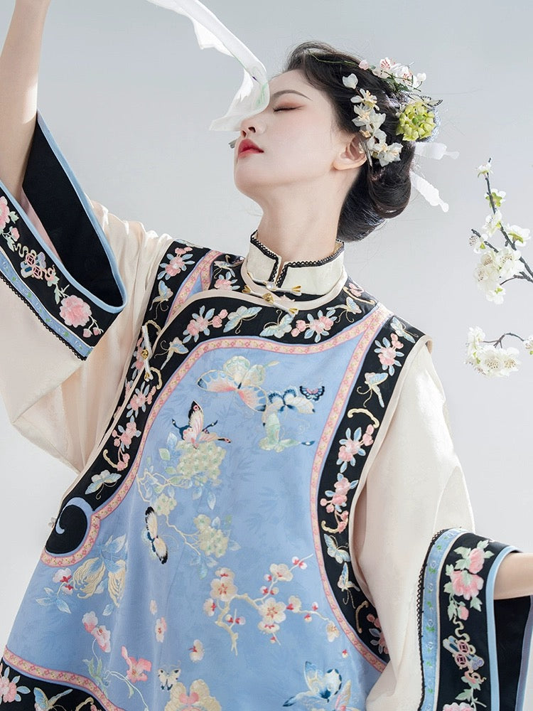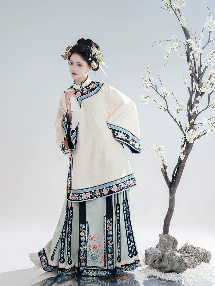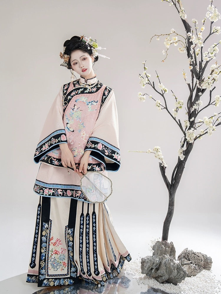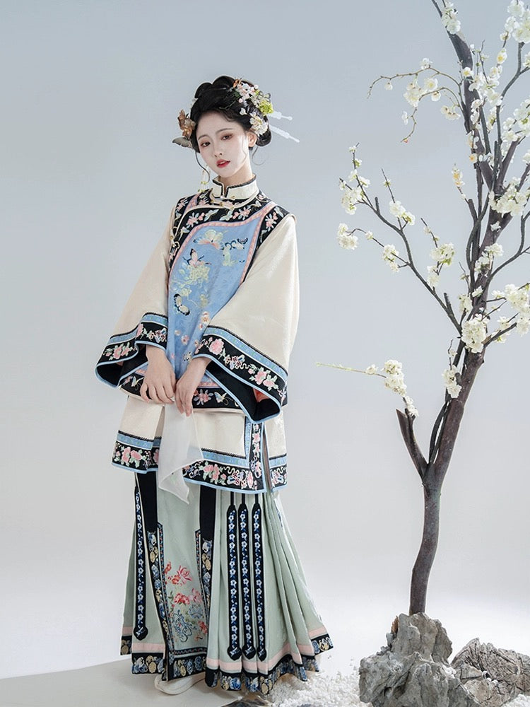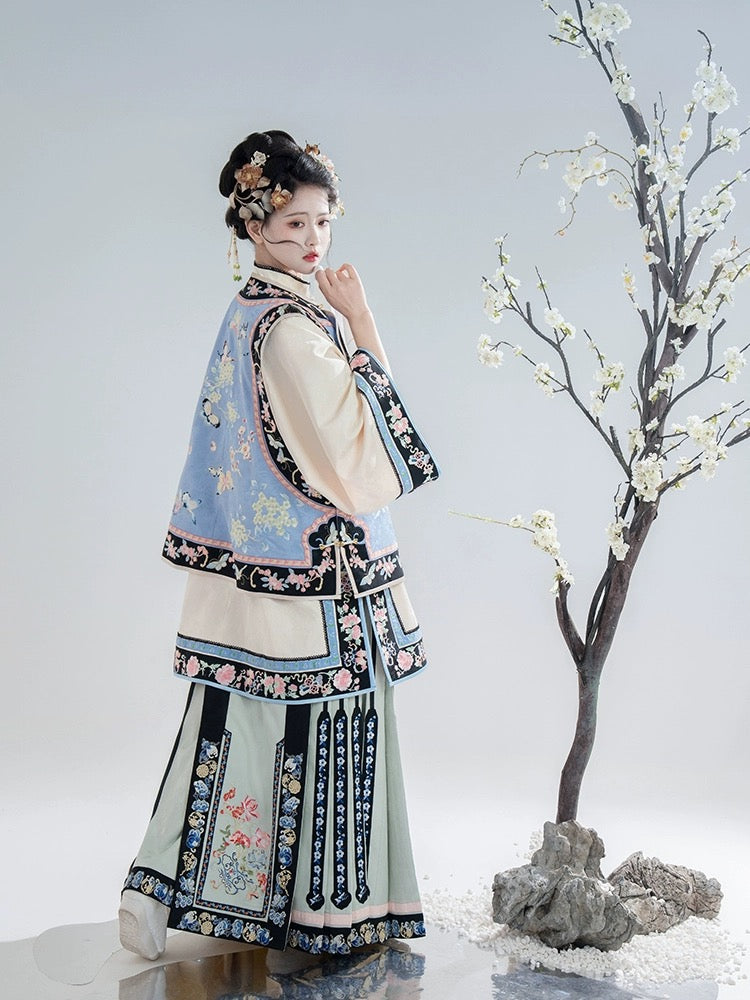 当社のオリジナルの丈夫な刺繍が施された清朝時代の婦人服で、清朝時代の精緻な職人技に浸ってください。このアンサンブルは、康熙時代のエレガントなファッションにインスピレーションを得たもので、細心の注意を払って作られたトップス、ベスト、mamianqun ラップ スカートが特徴です。