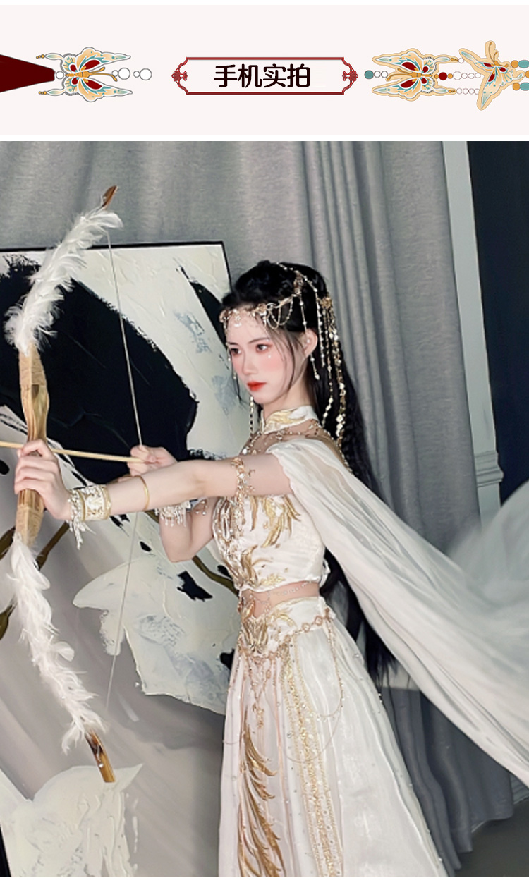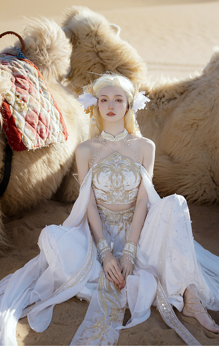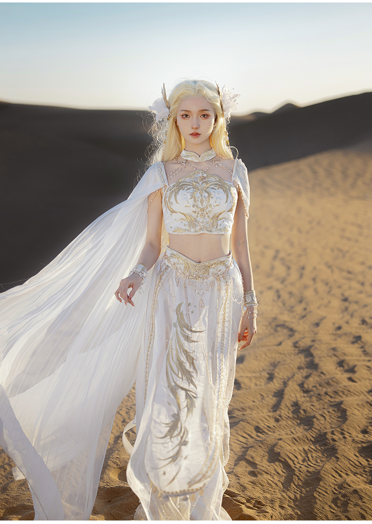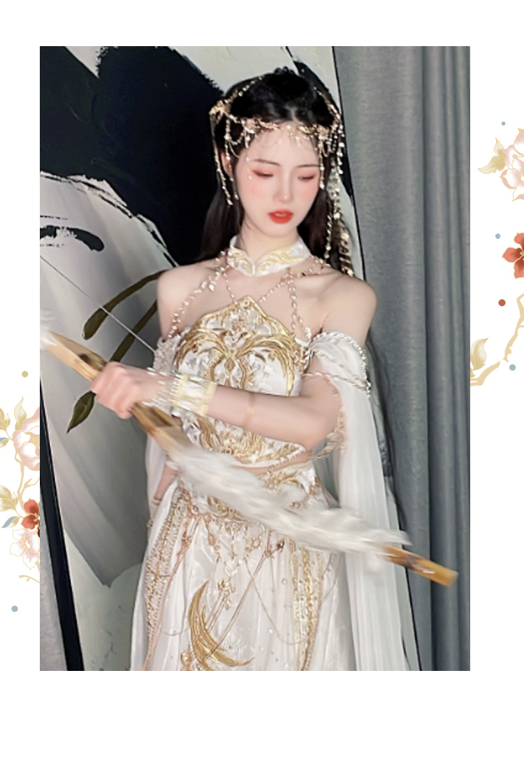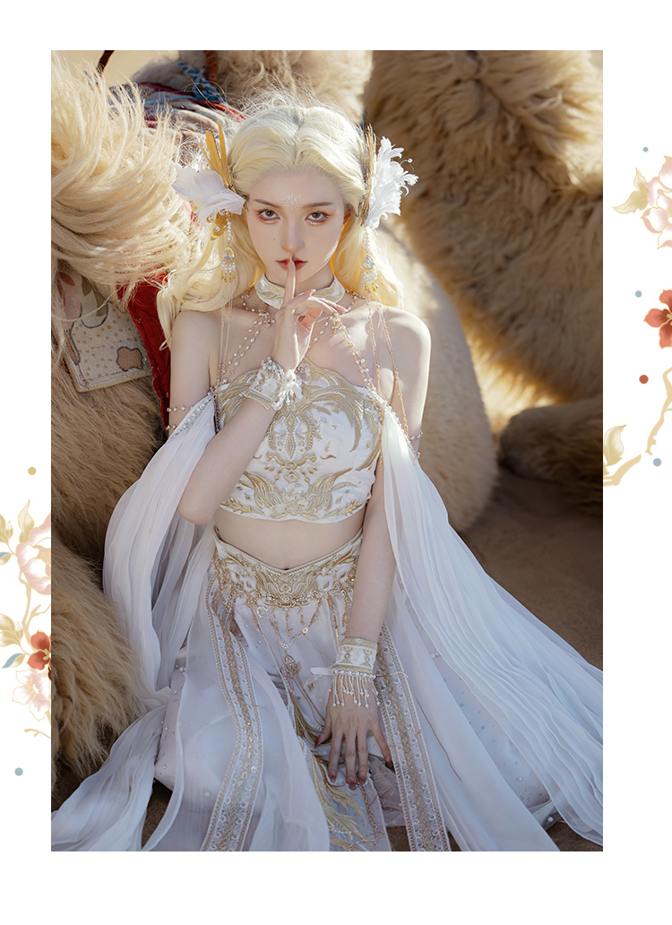 Step into the enchanting world of the ancient Silk Road and experience the fusion of Eastern and Western cultures with our Original Exotic Series Embroidered Dunhuang Flying Apsaras Western Style Hanfu Set. This exquisite ensemble captures the spirit of traditional and innovative design, inspired by the graceful flying apsaras depicted in Dunhuang murals.