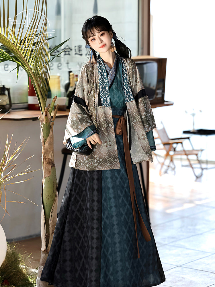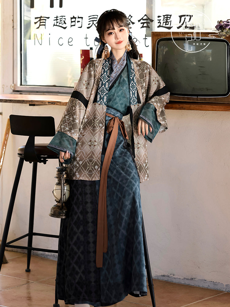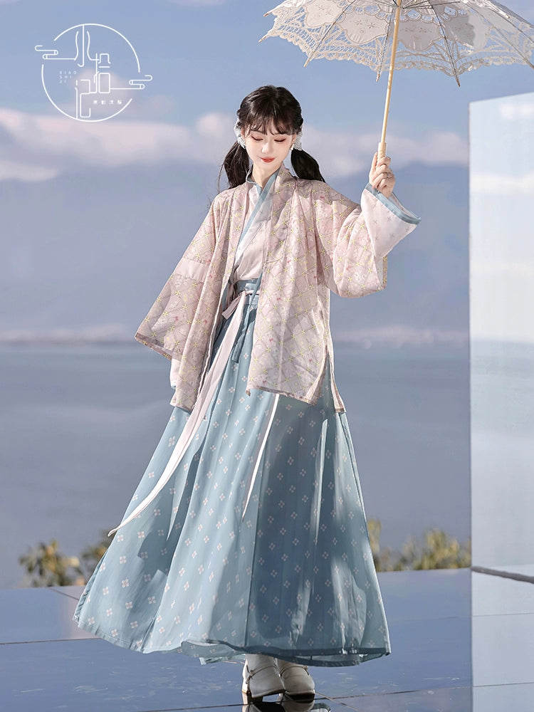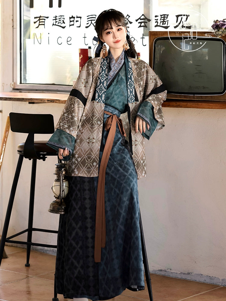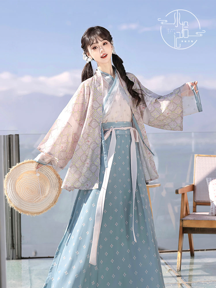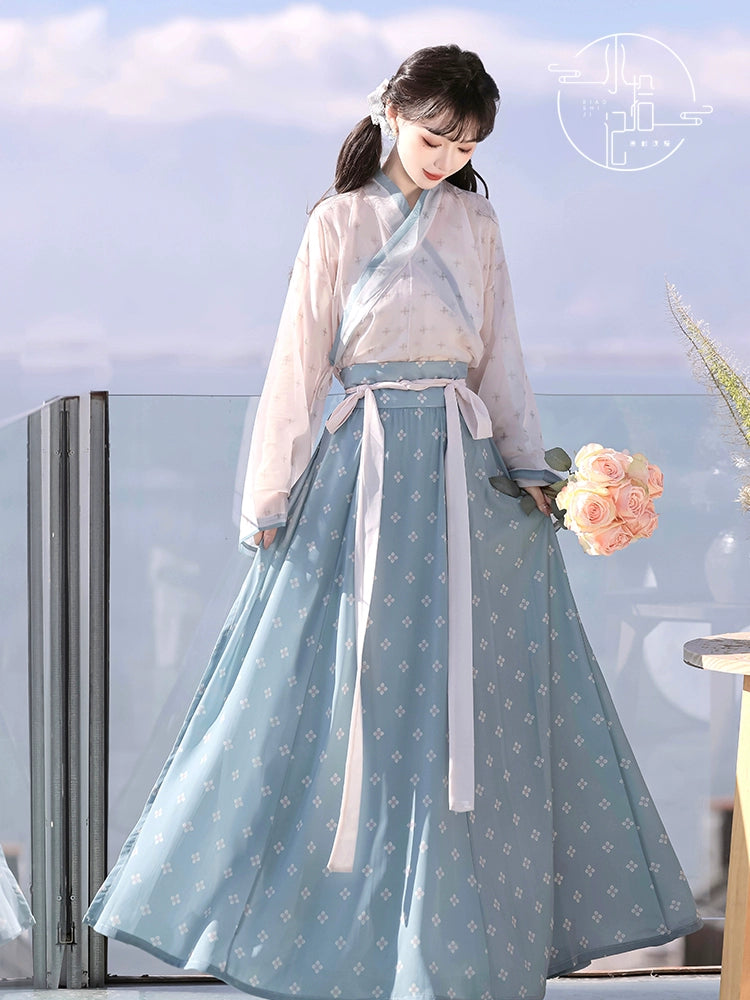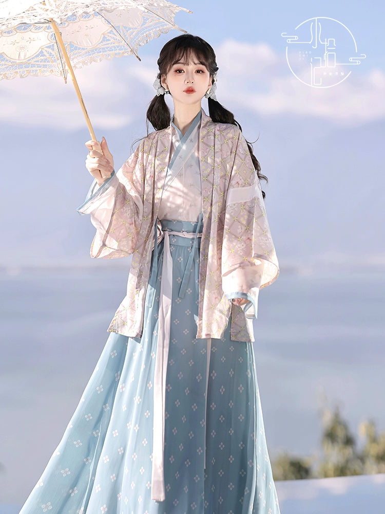 Hanfu, the traditional attire of the Han Chinese people, boasts a rich historical and cultural heritage along with unique aesthetic values. Characterized by its crossed collars, right-overlapping fronts, and tied belts, Hanfu exudes an elegant and flowing charm. It comes in various forms, including tops and skirts, one-piece robes, and tunic dresses, catering to both formal and casual occasions.