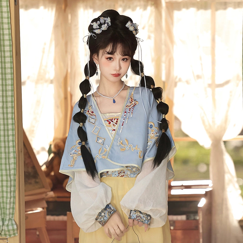 Hanfu, the traditional attire of the Han Chinese people, boasts a rich historical and cultural heritage along with unique aesthetic values. Characterized by its crossed collars, right-overlapping fronts, and tied belts, Hanfu exudes an elegant and flowing charm. It comes in various forms, including tops and skirts, one-piece robes, and tunic dresses, catering to both formal and casual occasions.
