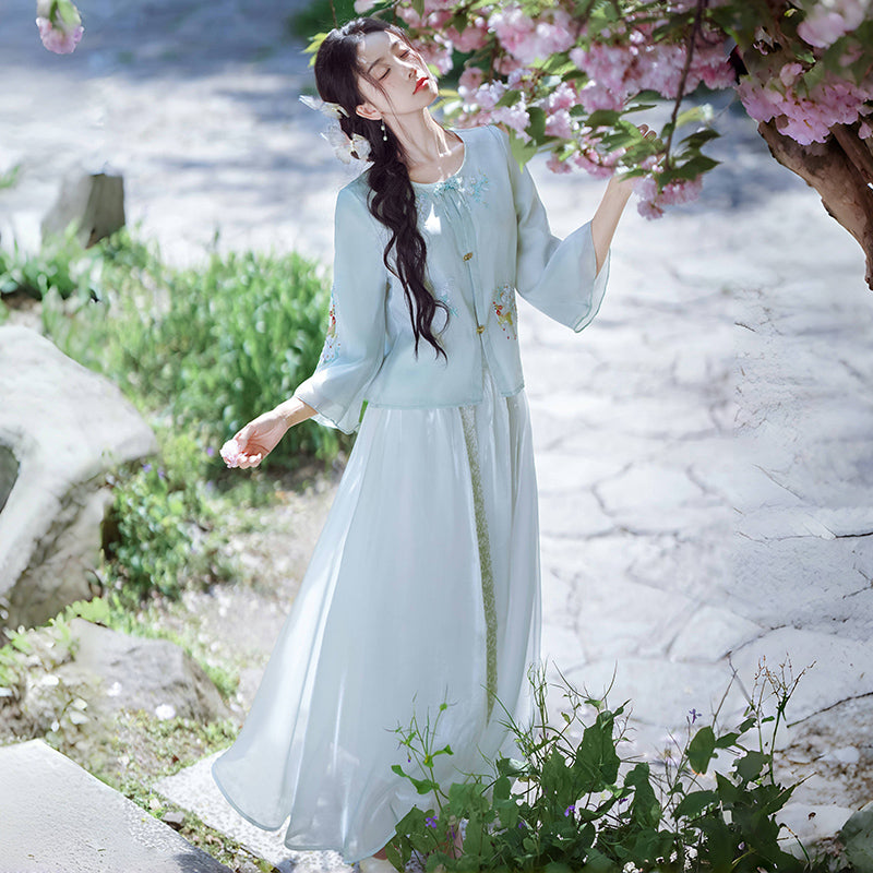 Hanfu, the traditional attire of the Han Chinese people, boasts a rich historical and cultural heritage along with unique aesthetic values. Characterized by its crossed collars, right-overlapping fronts, and tied belts, Hanfu exudes an elegant and flowing charm. It comes in various forms, including tops and skirts, one-piece robes, and tunic dresses, catering to both formal and casual occasions.
