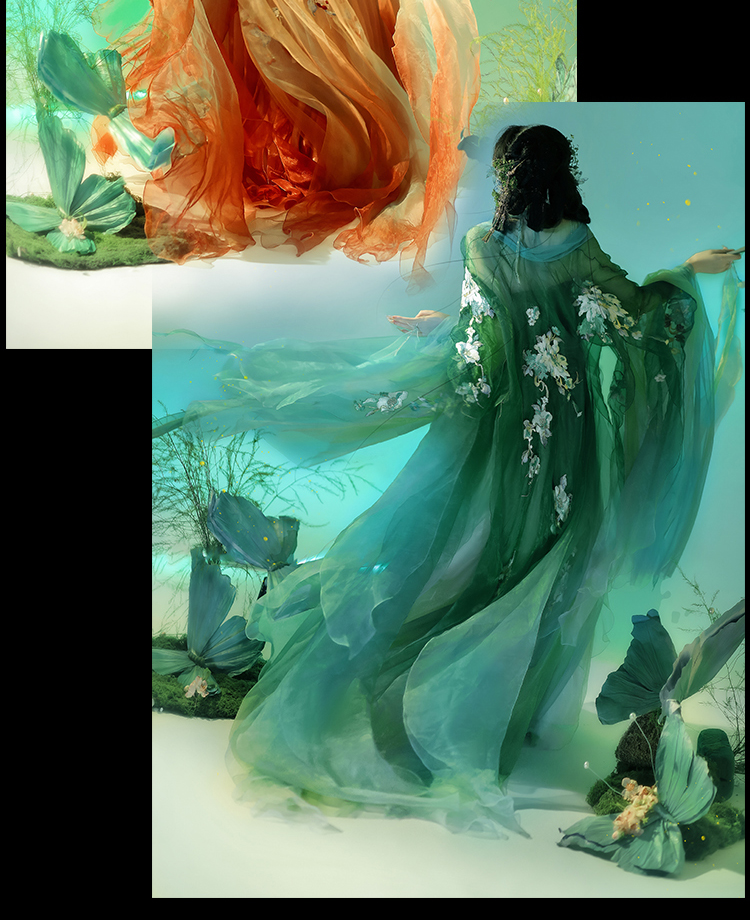 "Silk Road Reverie: Hanfu's Odyssey Through Ethnic Kaleidoscope", your fingers trace the Tang Dynasty roundel-patterned robe, suddenly discovering Sogdian ciphertext hidden in the sleeves—this is the original "Huxuan Dance Gown" An Lushan presented to Yang Guifei, the Persian craftsman whispers, "The lotus paste in this mooncake hides a Sogdian map... Follow the cumin-scented threads." When your gold-sprinkled silk shawl touches the artist's yak-hair brush, Tibetan script from the "Tubo Alliance Stele" emerges, "When Princess Wencheng's silk skirts met Tibetan wool, the Yarlung Tsangpo turned to liquid damask." Under UV light, hemline reveals Guge Kingdom mandala paintings. A Khotanese muralist tugs your sash, "Your 'lion motif' is actually our 'pomegranate dance pattern'!" Hanfu's jia xie resist-dyeing shares roots with Uyghur abrabandi tie-dye. A saukele headdress artisan transforms your bronze belt into modular instruments, left hook holding a Mongolian tovshuur lute, right loop carrying a Tajik eagle-bone flute, centerpiece displaying Xianbei gilded horse ornament, metal components auto-playing Kuchean-Twelve Muqam fusion under full moon. Under grapevines, a Ningxia embroiderer gasps at your "mountain-wave" pattern, "These 'peaks' mirror Helan Mountains, the 'surges' recreate Yellow River eddies!" Pleats woven with Tangut "Pearl in Palm" fragments become scannable with phones. As the Kyrgyz shaman's drum echoes, your composite-flower motifs morph into Yi solar calendar constellations, Khitan death mask filigree, Jurchen sea-eagle feather iridescence, unbuttoning the collar reveals Genghis Khan's multilingual travel permit. QR codes reveal 22 ethnic groups' textile DNA, body heat releases cinnamon/saffron scent capsules, sleeves extend into Mongolian wrestling sashes, each label includes Yi shaman-blessed silver plaque, Zhuang bronze drum soundwave QR, Evenki reindeer tendon thread sample. The capsule collection features Qinghai yak-down woven into Tang transparent-back gauze lined with Yangbajing geothermal film, Xianbei saddle-shaped girdle detaching into Kazakh dombra, Li barkcloth combined with Minnan mermaid silk revealing Zheng He's nautical charts when wet—"This isn't clothing—it's a UNESCO site you can wear to brunch." The cultural codex spans Dai palm-leaf sutra patterns thermo-chromically displaying Water Festival blessings, She mountain songs powering LEDs through friction, Hezhe fish-skin seams GPS-tagging Amur fishing seasons, inviting deeper exploration of Qiang watchtower stone patterns or Daur hockey elements fused with Tang polo robes.