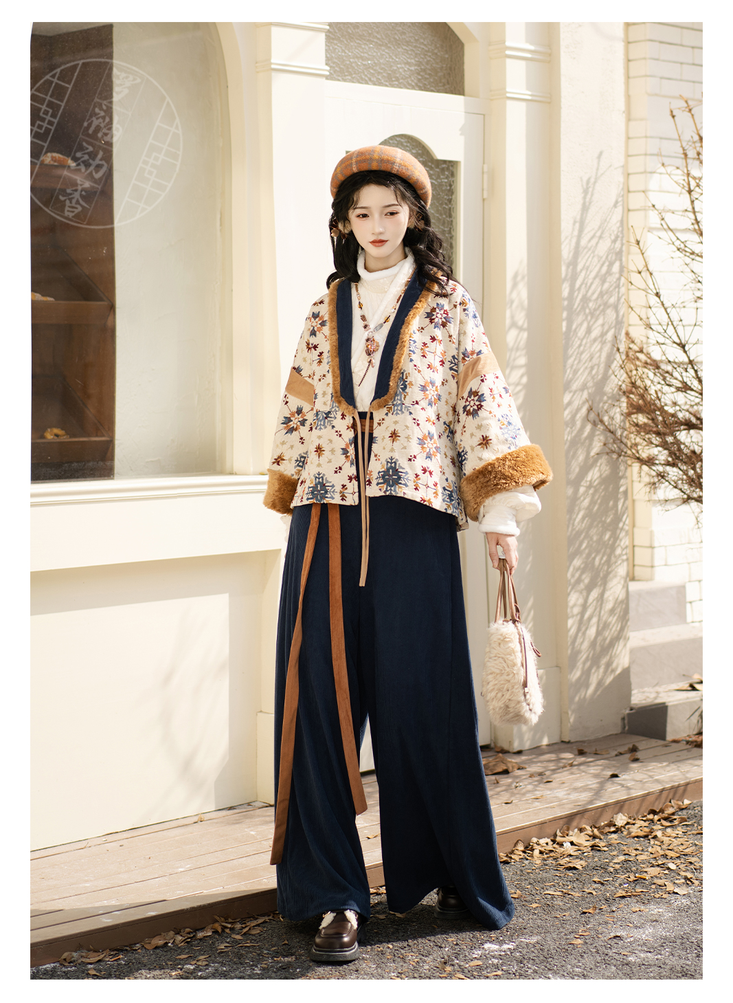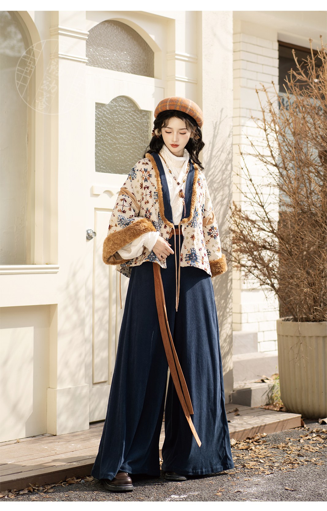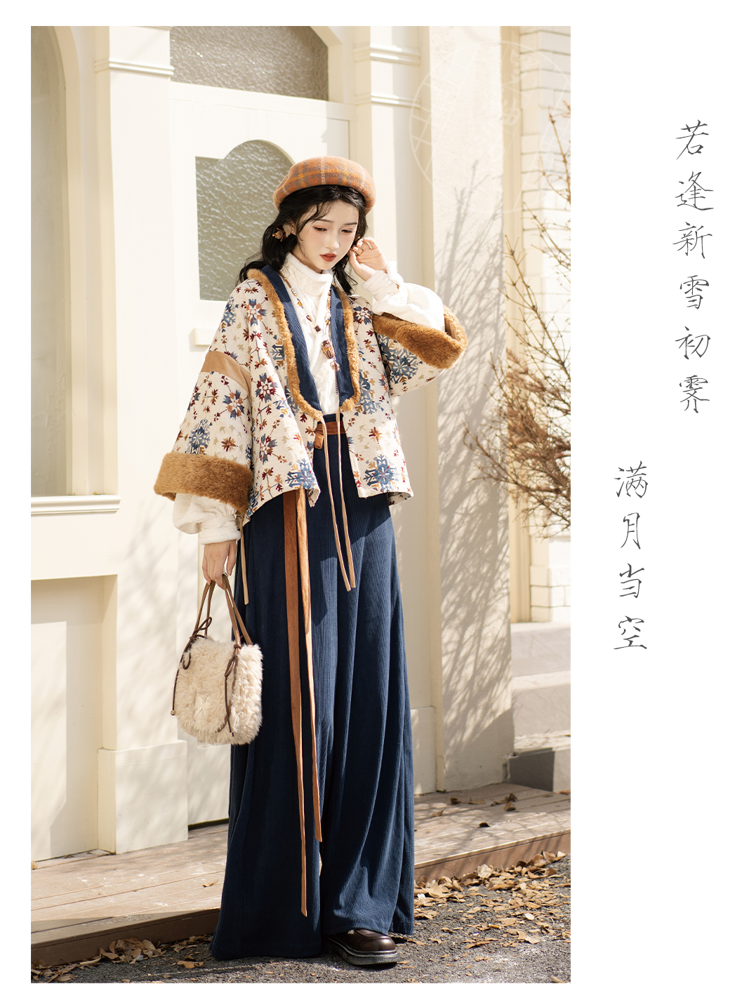 "Silk Road Reverie: Hanfu's Odyssey Through Ethnic Kaleidoscope", your fingers trace the Tang Dynasty roundel-patterned robe, suddenly discovering Sogdian ciphertext hidden in the sleeves—this is the original "Huxuan Dance Gown" An Lushan presented to Yang Guifei, the Persian craftsman whispers, "The lotus paste in this mooncake hides a Sogdian map... Follow the cumin-scented threads." When your gold-sprinkled silk shawl touches the artist's yak-hair brush, Tibetan script from the "Tubo Alliance Stele" emerges, "When Princess Wencheng's silk skirts met Tibetan wool, the Yarlung Tsangpo turned to liquid damask." Under UV light, hemline reveals Guge Kingdom mandala paintings. A Khotanese muralist tugs your sash, "Your 'lion motif' is actually our 'pomegranate dance pattern'!" Hanfu's jia xie resist-dyeing shares roots with Uyghur abrabandi tie-dye. A saukele headdress artisan transforms your bronze belt into modular instruments, left hook holding a Mongolian tovshuur lute, right loop carrying a Tajik eagle-bone flute, centerpiece displaying Xianbei gilded horse ornament, metal components auto-playing Kuchean-Twelve Muqam fusion under full moon. Under grapevines, a Ningxia embroiderer gasps at your "mountain-wave" pattern, "These 'peaks' mirror Helan Mountains, the 'surges' recreate Yellow River eddies!" Pleats woven with Tangut "Pearl in Palm" fragments become scannable with phones. As the Kyrgyz shaman's drum echoes, your composite-flower motifs morph into Yi solar calendar constellations, Khitan death mask filigree, Jurchen sea-eagle feather iridescence, unbuttoning the collar reveals Genghis Khan's multilingual travel permit. QR codes reveal 22 ethnic groups' textile DNA, body heat releases cinnamon/saffron scent capsules, sleeves extend into Mongolian wrestling sashes, each label includes Yi shaman-blessed silver plaque, Zhuang bronze drum soundwave QR, Evenki reindeer tendon thread sample. The capsule collection features Qinghai yak-down woven into Tang transparent-back gauze lined with Yangbajing geothermal film, Xianbei saddle-shaped girdle detaching into Kazakh dombra, Li barkcloth combined with Minnan mermaid silk revealing Zheng He's nautical charts when wet—"This isn't clothing—it's a UNESCO site you can wear to brunch." The cultural codex spans Dai palm-leaf sutra patterns thermo-chromically displaying Water Festival blessings, She mountain songs powering LEDs through friction, Hezhe fish-skin seams GPS-tagging Amur fishing seasons, inviting deeper exploration of Qiang watchtower stone patterns or Daur hockey elements fused with Tang polo robes.