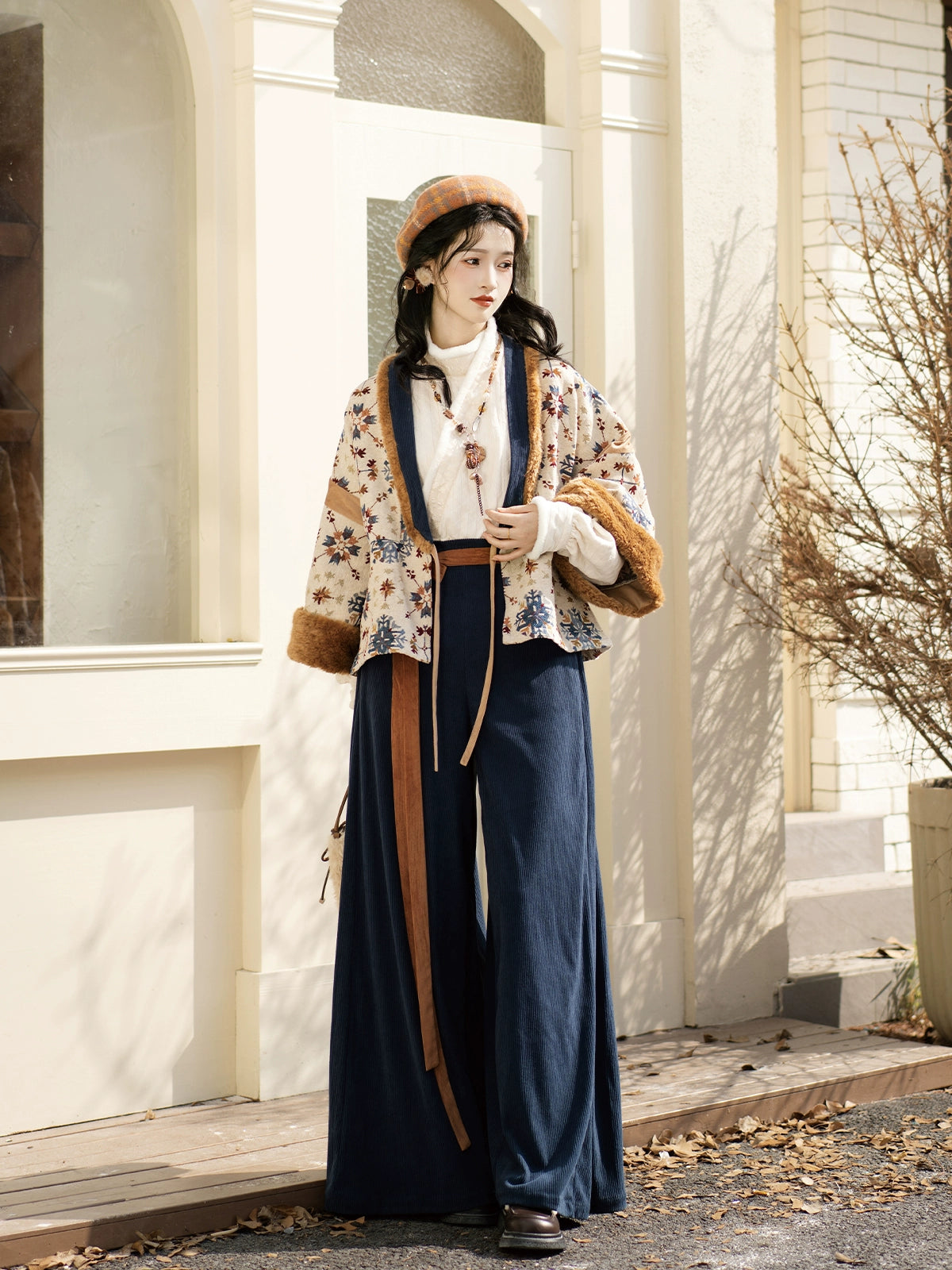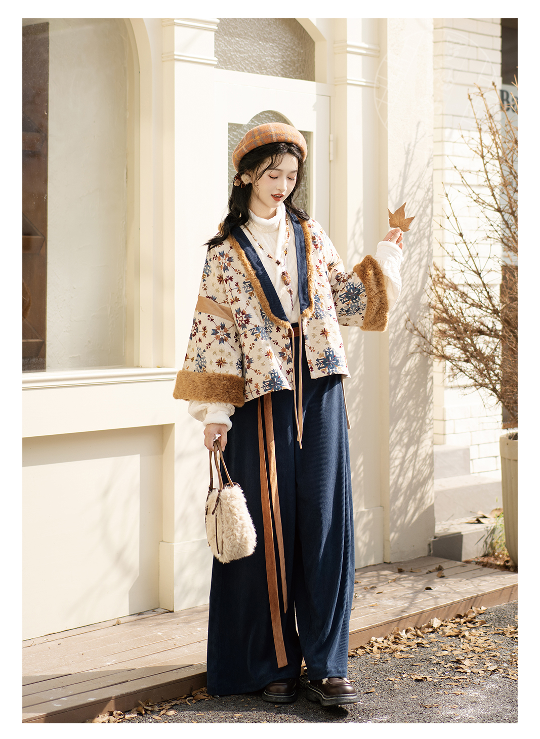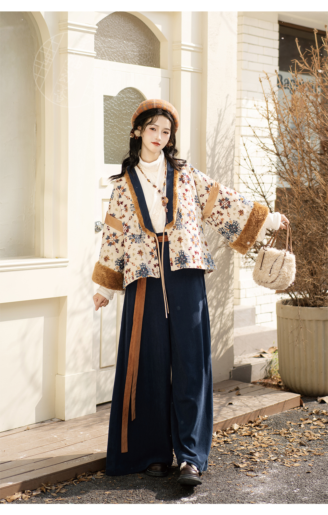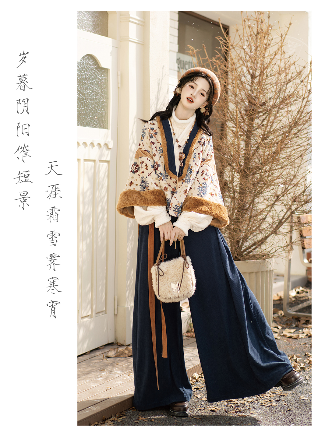 "Silk Road Reverie: Hanfu's Odyssey Through Ethnic Kaleidoscope", your fingers trace the Tang Dynasty roundel-patterned robe, suddenly discovering Sogdian ciphertext hidden in the sleeves—this is the original "Huxuan Dance Gown" An Lushan presented to Yang Guifei, the Persian craftsman whispers, "The lotus paste in this mooncake hides a Sogdian map... Follow the cumin-scented threads." When your gold-sprinkled silk shawl touches the artist's yak-hair brush, Tibetan script from the "Tubo Alliance Stele" emerges, "When Princess Wencheng's silk skirts met Tibetan wool, the Yarlung Tsangpo turned to liquid damask." Under UV light, hemline reveals Guge Kingdom mandala paintings. A Khotanese muralist tugs your sash, "Your 'lion motif' is actually our 'pomegranate dance pattern'!" Hanfu's jia xie resist-dyeing shares roots with Uyghur abrabandi tie-dye. A saukele headdress artisan transforms your bronze belt into modular instruments, left hook holding a Mongolian tovshuur lute, right loop carrying a Tajik eagle-bone flute, centerpiece displaying Xianbei gilded horse ornament, metal components auto-playing Kuchean-Twelve Muqam fusion under full moon. Under grapevines, a Ningxia embroiderer gasps at your "mountain-wave" pattern, "These 'peaks' mirror Helan Mountains, the 'surges' recreate Yellow River eddies!" Pleats woven with Tangut "Pearl in Palm" fragments become scannable with phones. As the Kyrgyz shaman's drum echoes, your composite-flower motifs morph into Yi solar calendar constellations, Khitan death mask filigree, Jurchen sea-eagle feather iridescence, unbuttoning the collar reveals Genghis Khan's multilingual travel permit. QR codes reveal 22 ethnic groups' textile DNA, body heat releases cinnamon/saffron scent capsules, sleeves extend into Mongolian wrestling sashes, each label includes Yi shaman-blessed silver plaque, Zhuang bronze drum soundwave QR, Evenki reindeer tendon thread sample. The capsule collection features Qinghai yak-down woven into Tang transparent-back gauze lined with Yangbajing geothermal film, Xianbei saddle-shaped girdle detaching into Kazakh dombra, Li barkcloth combined with Minnan mermaid silk revealing Zheng He's nautical charts when wet—"This isn't clothing—it's a UNESCO site you can wear to brunch." The cultural codex spans Dai palm-leaf sutra patterns thermo-chromically displaying Water Festival blessings, She mountain songs powering LEDs through friction, Hezhe fish-skin seams GPS-tagging Amur fishing seasons, inviting deeper exploration of Qiang watchtower stone patterns or Daur hockey elements fused with Tang polo robes.