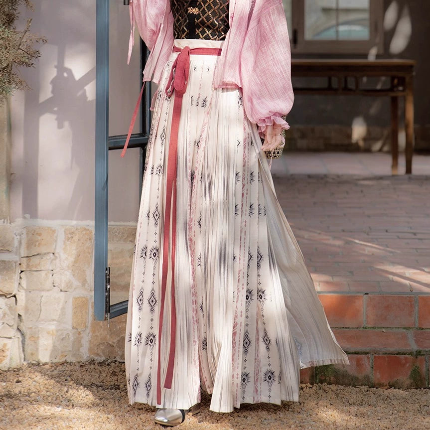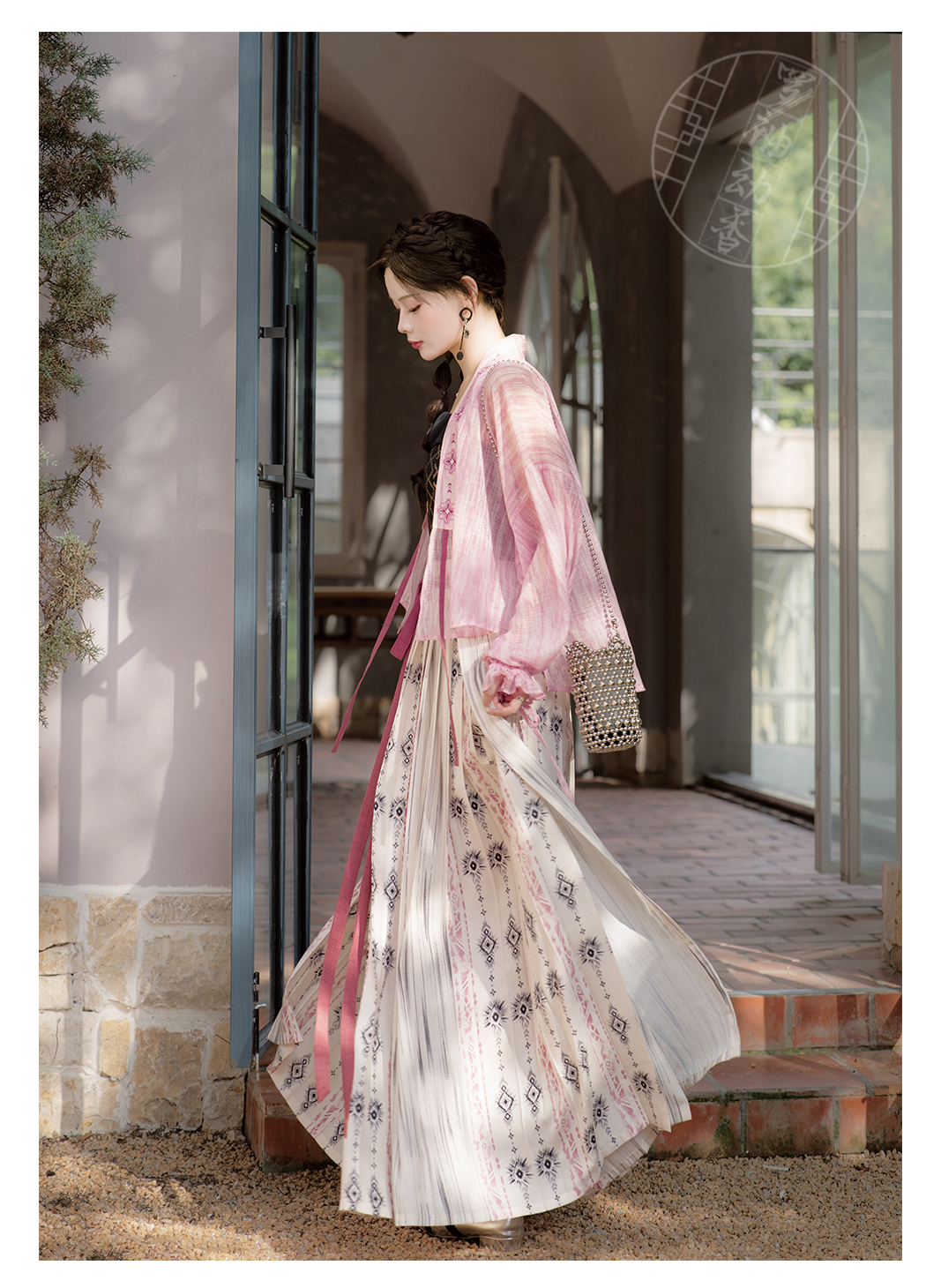"Silk Road Reverie: Hanfu's Odyssey Through Ethnic Kaleidoscope", your fingers trace the Tang Dynasty roundel-patterned robe, suddenly discovering Sogdian ciphertext hidden in the sleeves—this is the original "Huxuan Dance Gown" An Lushan presented to Yang Guifei, the Persian craftsman whispers, "The lotus paste in this mooncake hides a Sogdian map... Follow the cumin-scented threads." When your gold-sprinkled silk shawl touches the artist's yak-hair brush, Tibetan script from the "Tubo Alliance Stele" emerges, "When Princess Wencheng's silk skirts met Tibetan wool, the Yarlung Tsangpo turned to liquid damask." Under UV light, hemline reveals Guge Kingdom mandala paintings. A Khotanese muralist tugs your sash, "Your 'lion motif' is actually our 'pomegranate dance pattern'!" Hanfu's jia xie resist-dyeing shares roots with Uyghur abrabandi tie-dye. A saukele headdress artisan transforms your bronze belt into modular instruments, left hook holding a Mongolian tovshuur lute, right loop carrying a Tajik eagle-bone flute, centerpiece displaying Xianbei gilded horse ornament, metal components auto-playing Kuchean-Twelve Muqam fusion under full moon. Under grapevines, a Ningxia embroiderer gasps at your "mountain-wave" pattern, "These 'peaks' mirror Helan Mountains, the 'surges' recreate Yellow River eddies!" Pleats woven with Tangut "Pearl in Palm" fragments become scannable with phones. As the Kyrgyz shaman's drum echoes, your composite-flower motifs morph into Yi solar calendar constellations, Khitan death mask filigree, Jurchen sea-eagle feather iridescence, unbuttoning the collar reveals Genghis Khan's multilingual travel permit. QR codes reveal 22 ethnic groups' textile DNA, body heat releases cinnamon/saffron scent capsules, sleeves extend into Mongolian wrestling sashes, each label includes Yi shaman-blessed silver plaque, Zhuang bronze drum soundwave QR, Evenki reindeer tendon thread sample. The capsule collection features Qinghai yak-down woven into Tang transparent-back gauze lined with Yangbajing geothermal film, Xianbei saddle-shaped girdle detaching into Kazakh dombra, Li barkcloth combined with Minnan mermaid silk revealing Zheng He's nautical charts when wet—"This isn't clothing—it's a UNESCO site you can wear to brunch." The cultural codex spans Dai palm-leaf sutra patterns thermo-chromically displaying Water Festival blessings, She mountain songs powering LEDs through friction, Hezhe fish-skin seams GPS-tagging Amur fishing seasons, inviting deeper exploration of Qiang watchtower stone patterns or Daur hockey elements fused with Tang polo robes.