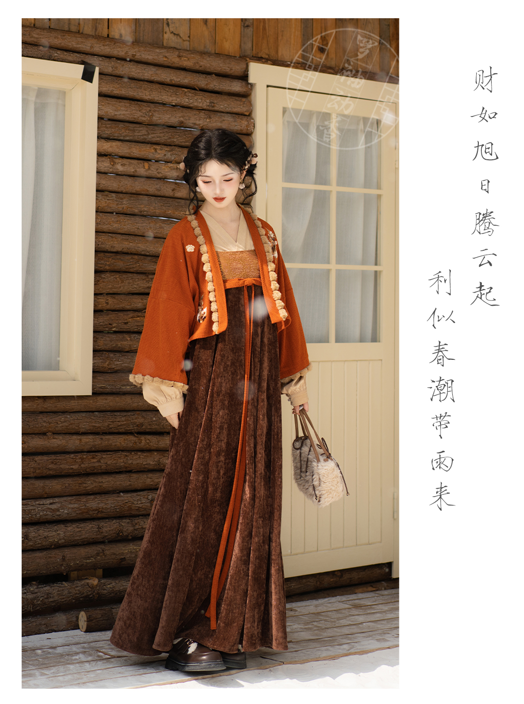 "Silk Road Reverie: Hanfu's Odyssey Through Ethnic Kaleidoscope", your fingers trace the Tang Dynasty roundel-patterned robe, suddenly discovering Sogdian ciphertext hidden in the sleeves—this is the original "Huxuan Dance Gown" An Lushan presented to Yang Guifei, the Persian craftsman whispers, "The lotus paste in this mooncake hides a Sogdian map... Follow the cumin-scented threads." When your gold-sprinkled silk shawl touches the artist's yak-hair brush, Tibetan script from the "Tubo Alliance Stele" emerges, "When Princess Wencheng's silk skirts met Tibetan wool, the Yarlung Tsangpo turned to liquid damask." Under UV light, hemline reveals Guge Kingdom mandala paintings. A Khotanese muralist tugs your sash, "Your 'lion motif' is actually our 'pomegranate dance pattern'!" Hanfu's jia xie resist-dyeing shares roots with Uyghur abrabandi tie-dye. A saukele headdress artisan transforms your bronze belt into modular instruments, left hook holding a Mongolian tovshuur lute, right loop carrying a Tajik eagle-bone flute, centerpiece displaying Xianbei gilded horse ornament, metal components auto-playing Kuchean-Twelve Muqam fusion under full moon. Under grapevines, a Ningxia embroiderer gasps at your "mountain-wave" pattern, "These 'peaks' mirror Helan Mountains, the 'surges' recreate Yellow River eddies!" Pleats woven with Tangut "Pearl in Palm" fragments become scannable with phones. As the Kyrgyz shaman's drum echoes, your composite-flower motifs morph into Yi solar calendar constellations, Khitan death mask filigree, Jurchen sea-eagle feather iridescence, unbuttoning the collar reveals Genghis Khan's multilingual travel permit. QR codes reveal 22 ethnic groups' textile DNA, body heat releases cinnamon/saffron scent capsules, sleeves extend into Mongolian wrestling sashes, each label includes Yi shaman-blessed silver plaque, Zhuang bronze drum soundwave QR, Evenki reindeer tendon thread sample. The capsule collection features Qinghai yak-down woven into Tang transparent-back gauze lined with Yangbajing geothermal film, Xianbei saddle-shaped girdle detaching into Kazakh dombra, Li barkcloth combined with Minnan mermaid silk revealing Zheng He's nautical charts when wet—"This isn't clothing—it's a UNESCO site you can wear to brunch." The cultural codex spans Dai palm-leaf sutra patterns thermo-chromically displaying Water Festival blessings, She mountain songs powering LEDs through friction, Hezhe fish-skin seams GPS-tagging Amur fishing seasons, inviting deeper exploration of Qiang watchtower stone patterns or Daur hockey elements fused with Tang polo robes.