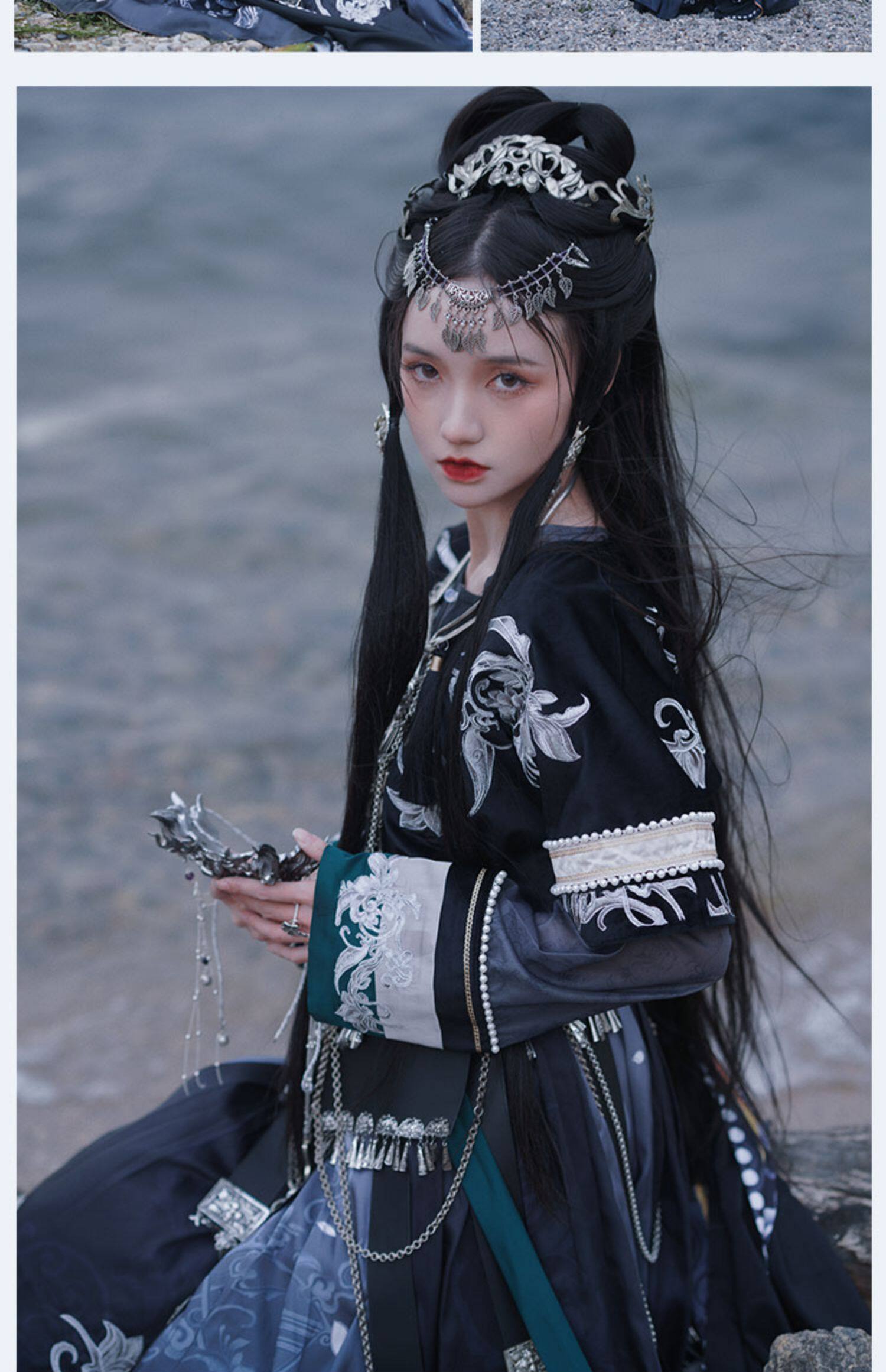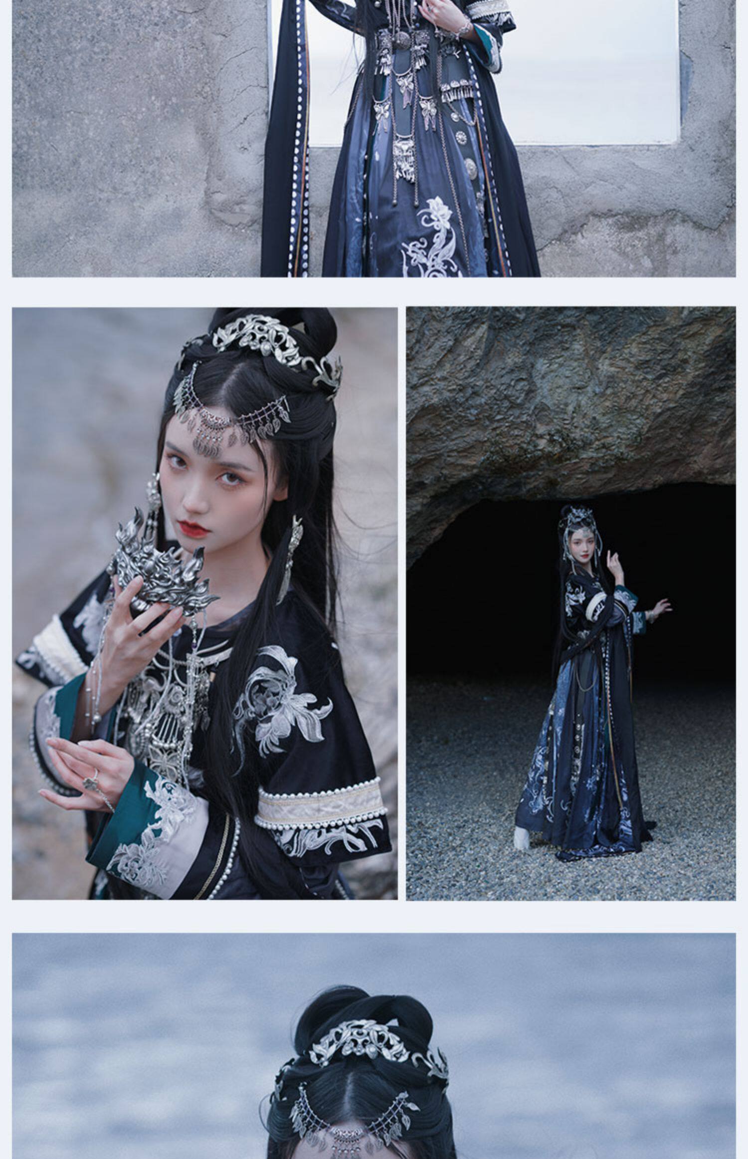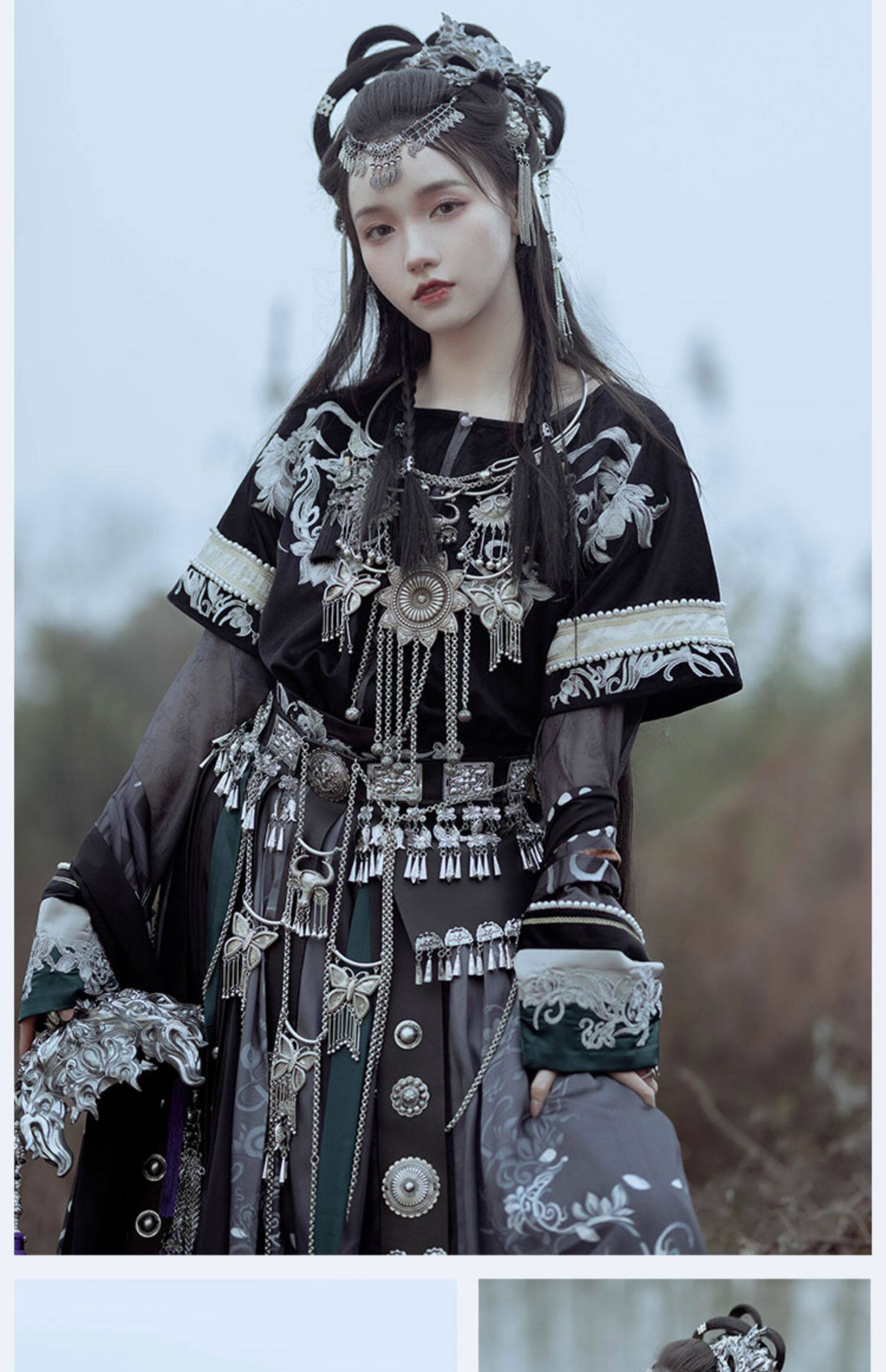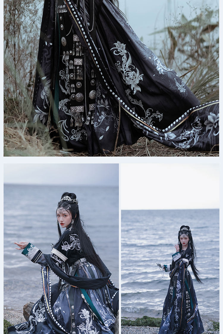 "Silk Road Reverie: Hanfu's Odyssey Through Ethnic Kaleidoscope", your fingers trace the Tang Dynasty roundel-patterned robe, suddenly discovering Sogdian ciphertext hidden in the sleeves—this is the original "Huxuan Dance Gown" An Lushan presented to Yang Guifei, the Persian craftsman whispers, "The lotus paste in this mooncake hides a Sogdian map... Follow the cumin-scented threads." When your gold-sprinkled silk shawl touches the artist's yak-hair brush, Tibetan script from the "Tubo Alliance Stele" emerges, "When Princess Wencheng's silk skirts met Tibetan wool, the Yarlung Tsangpo turned to liquid damask." Under UV light, hemline reveals Guge Kingdom mandala paintings. A Khotanese muralist tugs your sash, "Your 'lion motif' is actually our 'pomegranate dance pattern'!" Hanfu's jia xie resist-dyeing shares roots with Uyghur abrabandi tie-dye. A saukele headdress artisan transforms your bronze belt into modular instruments, left hook holding a Mongolian tovshuur lute, right loop carrying a Tajik eagle-bone flute, centerpiece displaying Xianbei gilded horse ornament, metal components auto-playing Kuchean-Twelve Muqam fusion under full moon. Under grapevines, a Ningxia embroiderer gasps at your "mountain-wave" pattern, "These 'peaks' mirror Helan Mountains, the 'surges' recreate Yellow River eddies!" Pleats woven with Tangut "Pearl in Palm" fragments become scannable with phones. As the Kyrgyz shaman's drum echoes, your composite-flower motifs morph into Yi solar calendar constellations, Khitan death mask filigree, Jurchen sea-eagle feather iridescence, unbuttoning the collar reveals Genghis Khan's multilingual travel permit. QR codes reveal 22 ethnic groups' textile DNA, body heat releases cinnamon/saffron scent capsules, sleeves extend into Mongolian wrestling sashes, each label includes Yi shaman-blessed silver plaque, Zhuang bronze drum soundwave QR, Evenki reindeer tendon thread sample. The capsule collection features Qinghai yak-down woven into Tang transparent-back gauze lined with Yangbajing geothermal film, Xianbei saddle-shaped girdle detaching into Kazakh dombra, Li barkcloth combined with Minnan mermaid silk revealing Zheng He's nautical charts when wet—"This isn't clothing—it's a UNESCO site you can wear to brunch." The cultural codex spans Dai palm-leaf sutra patterns thermo-chromically displaying Water Festival blessings, She mountain songs powering LEDs through friction, Hezhe fish-skin seams GPS-tagging Amur fishing seasons, inviting deeper exploration of Qiang watchtower stone patterns or Daur hockey elements fused with Tang polo robes.