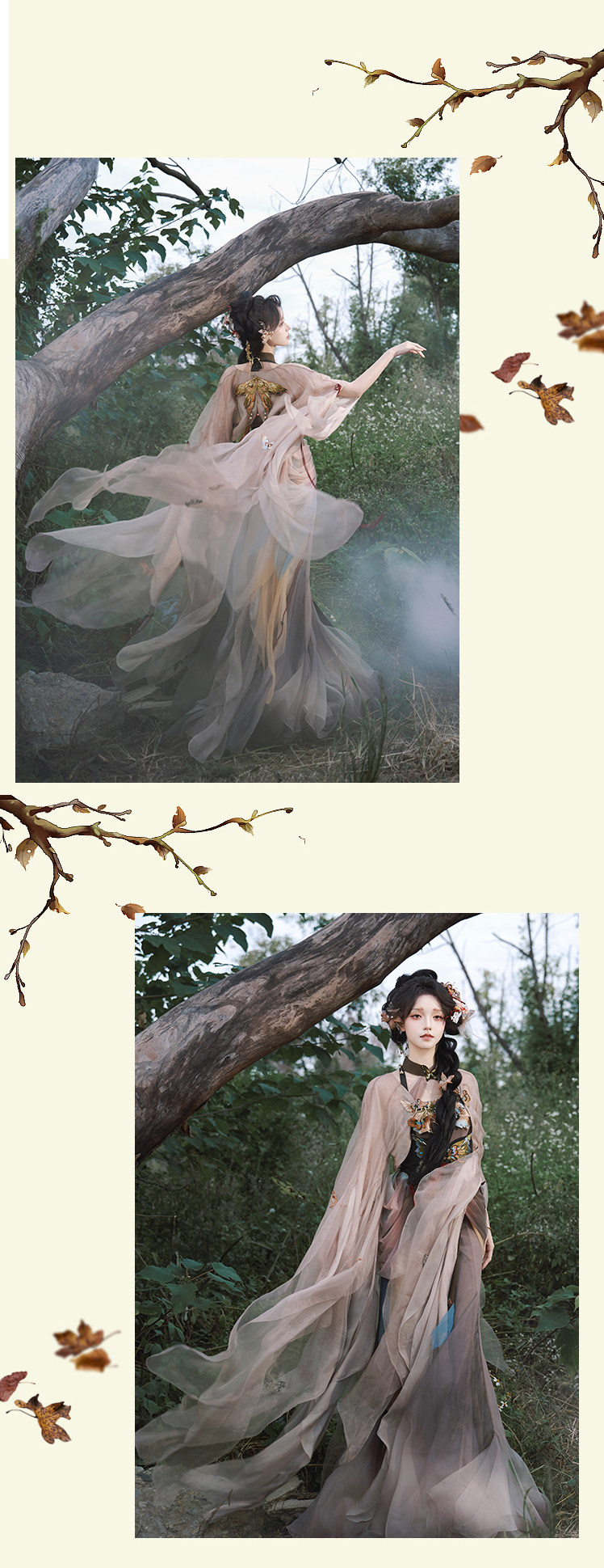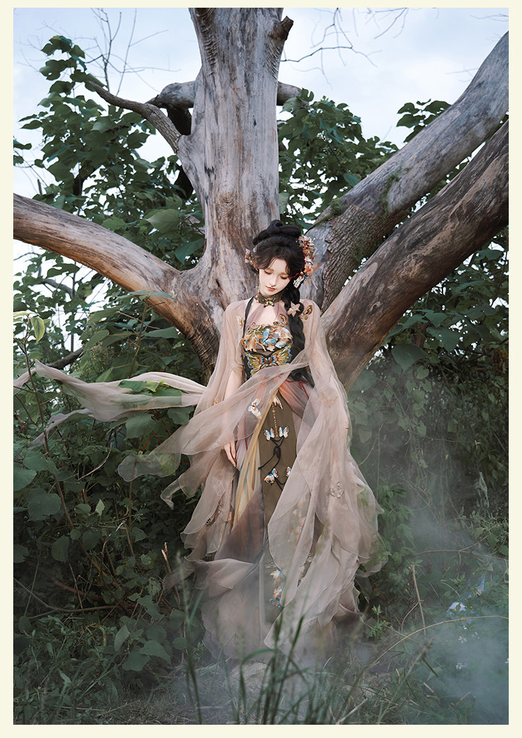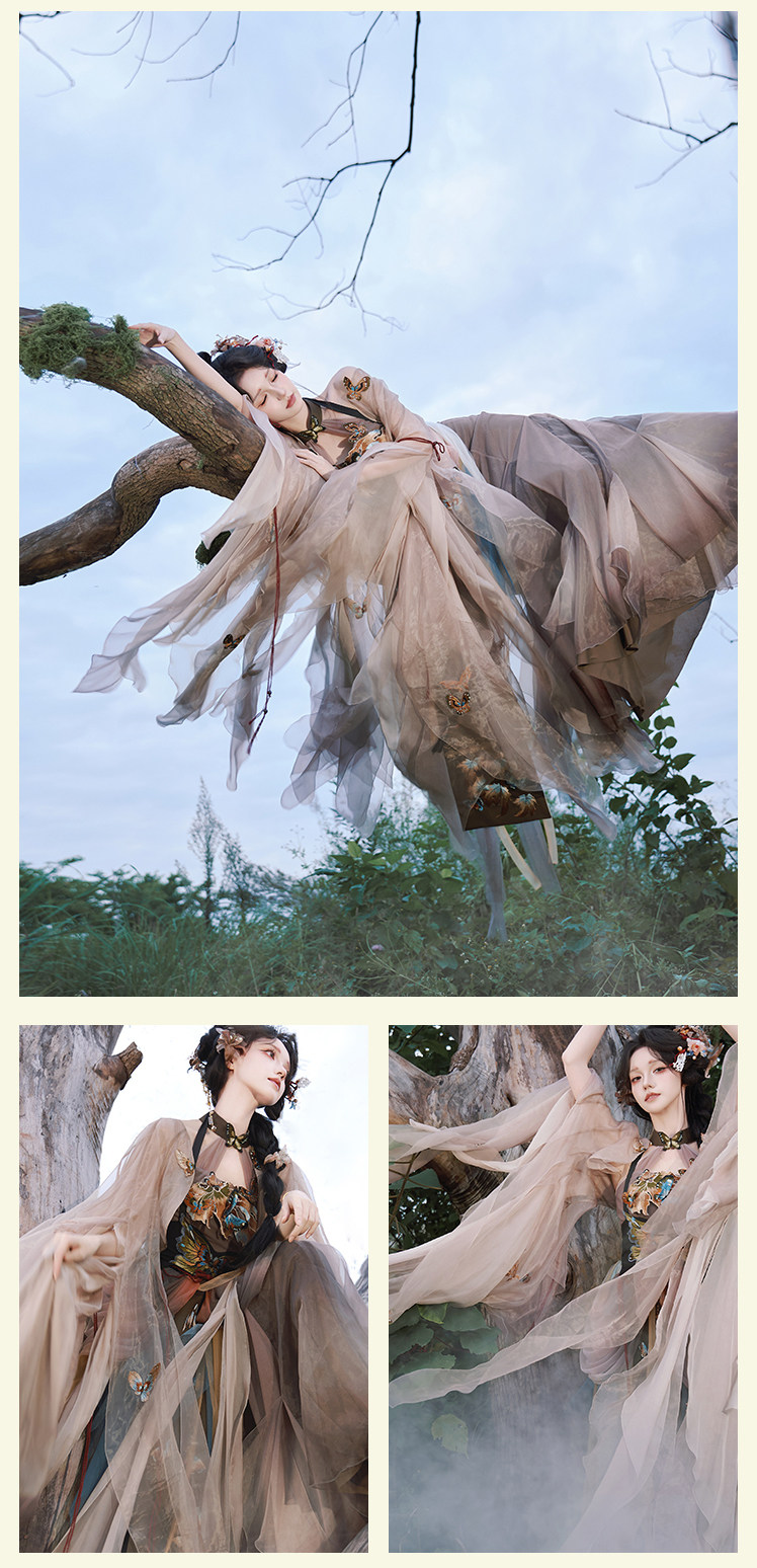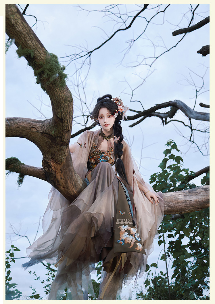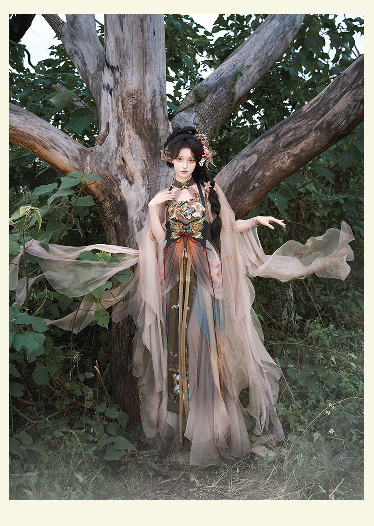 "Silk Road Reverie: Hanfu's Odyssey Through Ethnic Kaleidoscope", your fingers trace the Tang Dynasty roundel-patterned robe, suddenly discovering Sogdian ciphertext hidden in the sleeves—this is the original "Huxuan Dance Gown" An Lushan presented to Yang Guifei, the Persian craftsman whispers, "The lotus paste in this mooncake hides a Sogdian map... Follow the cumin-scented threads." When your gold-sprinkled silk shawl touches the artist's yak-hair brush, Tibetan script from the "Tubo Alliance Stele" emerges, "When Princess Wencheng's silk skirts met Tibetan wool, the Yarlung Tsangpo turned to liquid damask." Under UV light, hemline reveals Guge Kingdom mandala paintings. A Khotanese muralist tugs your sash, "Your 'lion motif' is actually our 'pomegranate dance pattern'!" Hanfu's jia xie resist-dyeing shares roots with Uyghur abrabandi tie-dye. A saukele headdress artisan transforms your bronze belt into modular instruments, left hook holding a Mongolian tovshuur lute, right loop carrying a Tajik eagle-bone flute, centerpiece displaying Xianbei gilded horse ornament, metal components auto-playing Kuchean-Twelve Muqam fusion under full moon. Under grapevines, a Ningxia embroiderer gasps at your "mountain-wave" pattern, "These 'peaks' mirror Helan Mountains, the 'surges' recreate Yellow River eddies!" Pleats woven with Tangut "Pearl in Palm" fragments become scannable with phones. As the Kyrgyz shaman's drum echoes, your composite-flower motifs morph into Yi solar calendar constellations, Khitan death mask filigree, Jurchen sea-eagle feather iridescence, unbuttoning the collar reveals Genghis Khan's multilingual travel permit. QR codes reveal 22 ethnic groups' textile DNA, body heat releases cinnamon/saffron scent capsules, sleeves extend into Mongolian wrestling sashes, each label includes Yi shaman-blessed silver plaque, Zhuang bronze drum soundwave QR, Evenki reindeer tendon thread sample. The capsule collection features Qinghai yak-down woven into Tang transparent-back gauze lined with Yangbajing geothermal film, Xianbei saddle-shaped girdle detaching into Kazakh dombra, Li barkcloth combined with Minnan mermaid silk revealing Zheng He's nautical charts when wet—"This isn't clothing—it's a UNESCO site you can wear to brunch." The cultural codex spans Dai palm-leaf sutra patterns thermo-chromically displaying Water Festival blessings, She mountain songs powering LEDs through friction, Hezhe fish-skin seams GPS-tagging Amur fishing seasons, inviting deeper exploration of Qiang watchtower stone patterns or Daur hockey elements fused with Tang polo robes.