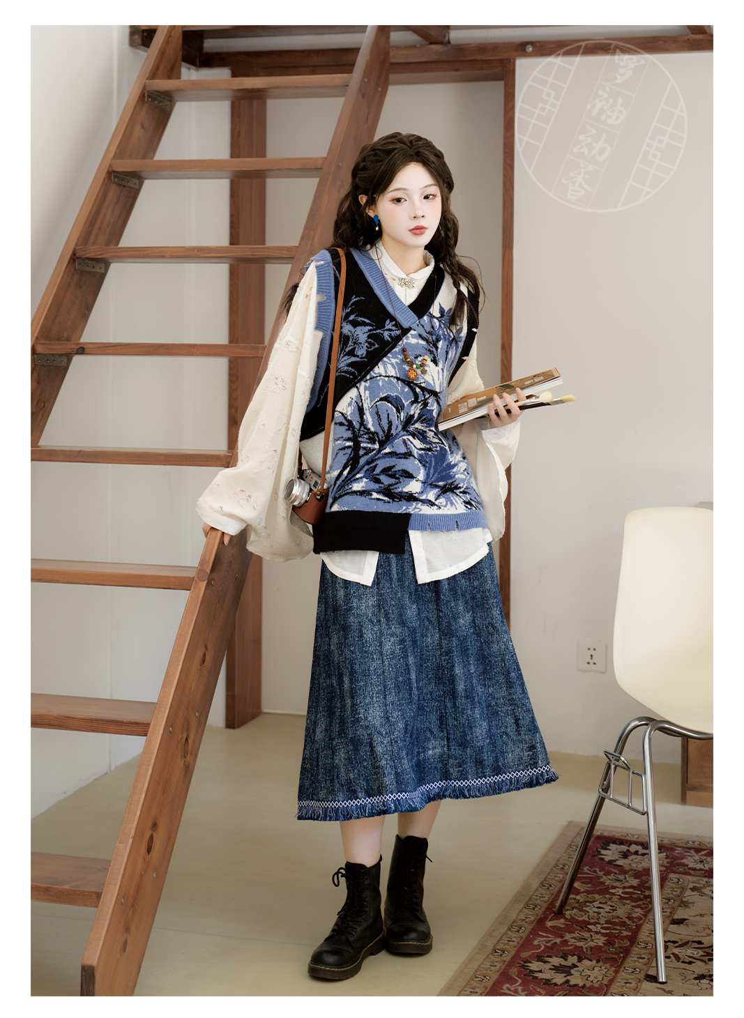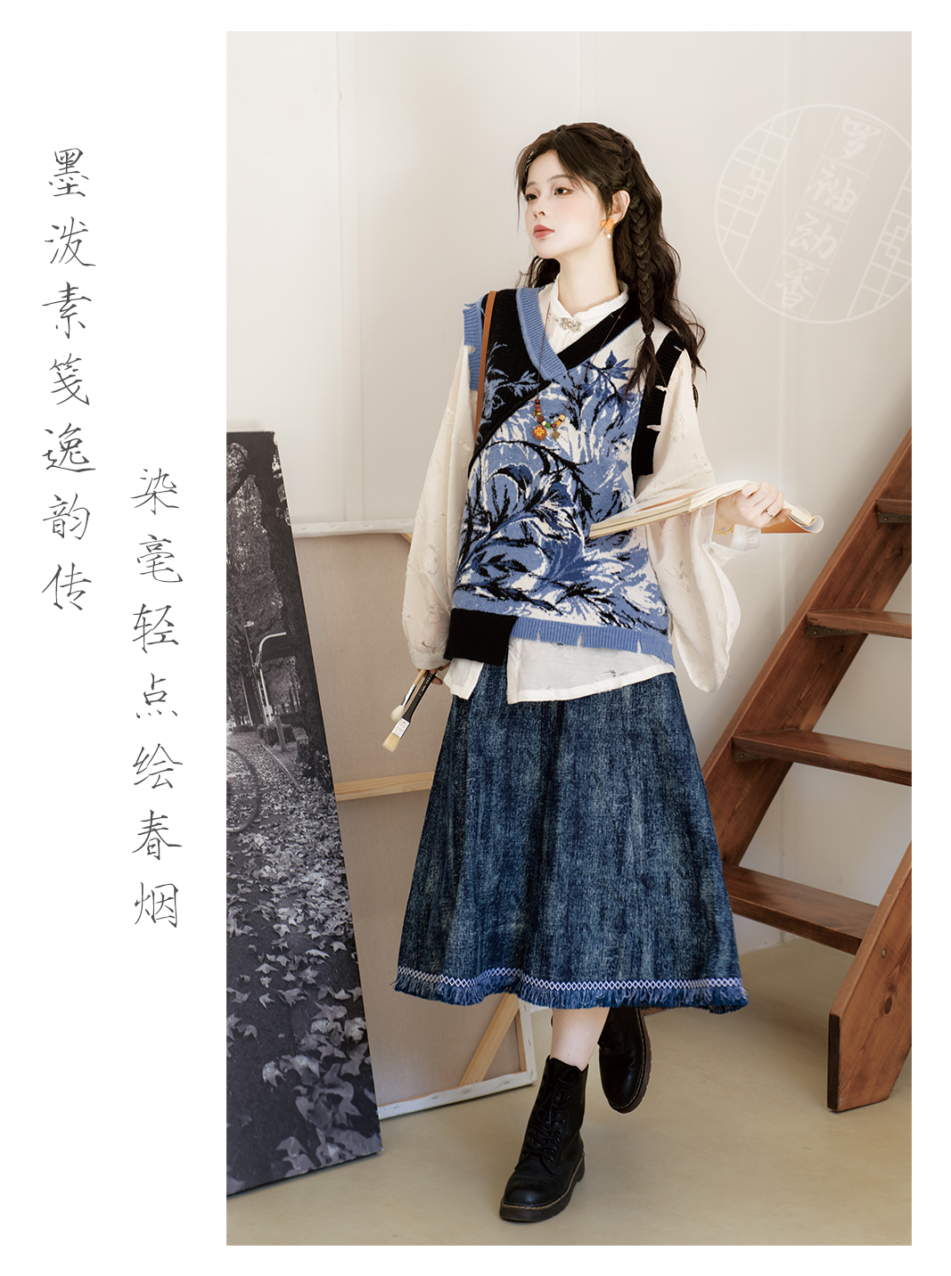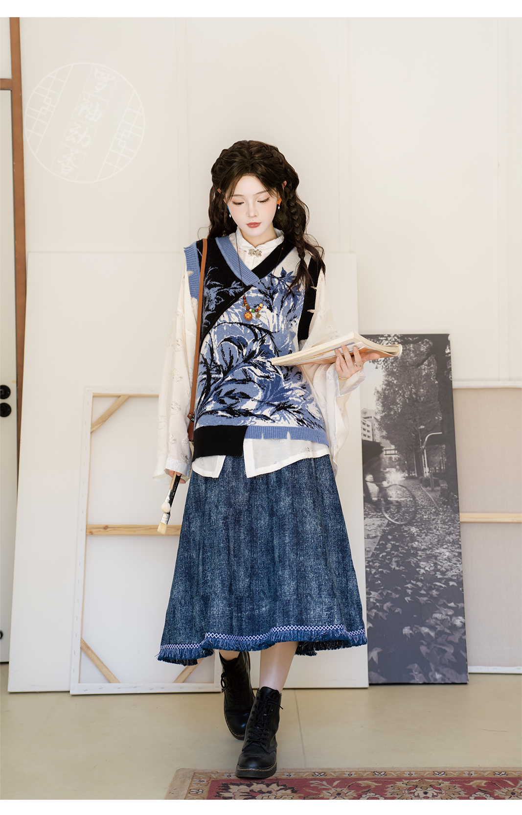 "Silk Road Reverie: Hanfu's Odyssey Through Ethnic Kaleidoscope", your fingers trace the Tang Dynasty roundel-patterned robe, suddenly discovering Sogdian ciphertext hidden in the sleeves—this is the original "Huxuan Dance Gown" An Lushan presented to Yang Guifei, the Persian craftsman whispers, "The lotus paste in this mooncake hides a Sogdian map... Follow the cumin-scented threads." When your gold-sprinkled silk shawl touches the artist's yak-hair brush, Tibetan script from the "Tubo Alliance Stele" emerges, "When Princess Wencheng's silk skirts met Tibetan wool, the Yarlung Tsangpo turned to liquid damask." Under UV light, hemline reveals Guge Kingdom mandala paintings. A Khotanese muralist tugs your sash, "Your 'lion motif' is actually our 'pomegranate dance pattern'!" Hanfu's jia xie resist-dyeing shares roots with Uyghur abrabandi tie-dye. A saukele headdress artisan transforms your bronze belt into modular instruments, left hook holding a Mongolian tovshuur lute, right loop carrying a Tajik eagle-bone flute, centerpiece displaying Xianbei gilded horse ornament, metal components auto-playing Kuchean-Twelve Muqam fusion under full moon. Under grapevines, a Ningxia embroiderer gasps at your "mountain-wave" pattern, "These 'peaks' mirror Helan Mountains, the 'surges' recreate Yellow River eddies!" Pleats woven with Tangut "Pearl in Palm" fragments become scannable with phones. As the Kyrgyz shaman's drum echoes, your composite-flower motifs morph into Yi solar calendar constellations, Khitan death mask filigree, Jurchen sea-eagle feather iridescence, unbuttoning the collar reveals Genghis Khan's multilingual travel permit. QR codes reveal 22 ethnic groups' textile DNA, body heat releases cinnamon/saffron scent capsules, sleeves extend into Mongolian wrestling sashes, each label includes Yi shaman-blessed silver plaque, Zhuang bronze drum soundwave QR, Evenki reindeer tendon thread sample. The capsule collection features Qinghai yak-down woven into Tang transparent-back gauze lined with Yangbajing geothermal film, Xianbei saddle-shaped girdle detaching into Kazakh dombra, Li barkcloth combined with Minnan mermaid silk revealing Zheng He's nautical charts when wet—"This isn't clothing—it's a UNESCO site you can wear to brunch." The cultural codex spans Dai palm-leaf sutra patterns thermo-chromically displaying Water Festival blessings, She mountain songs powering LEDs through friction, Hezhe fish-skin seams GPS-tagging Amur fishing seasons, inviting deeper exploration of Qiang watchtower stone patterns or Daur hockey elements fused with Tang polo robes.