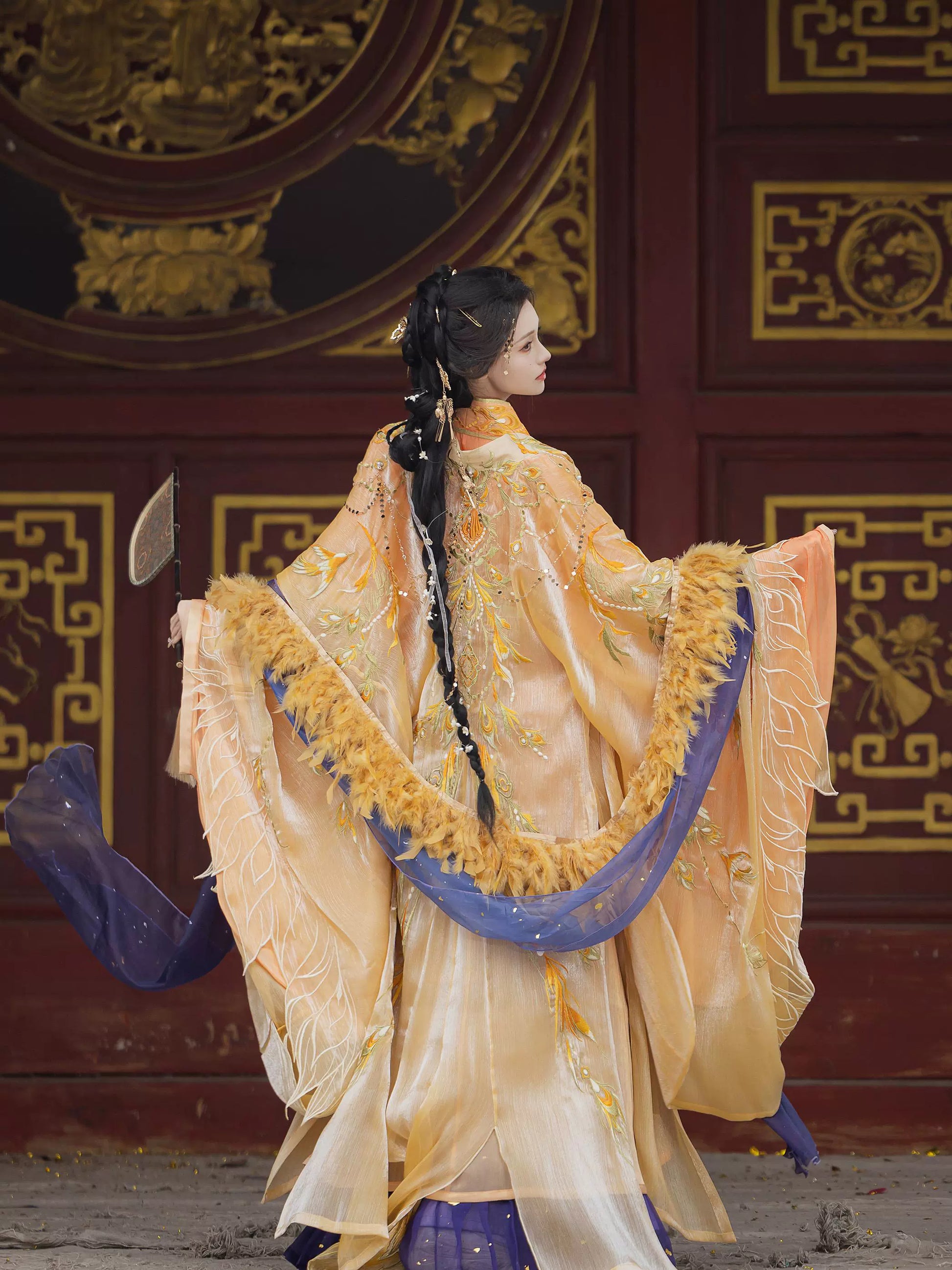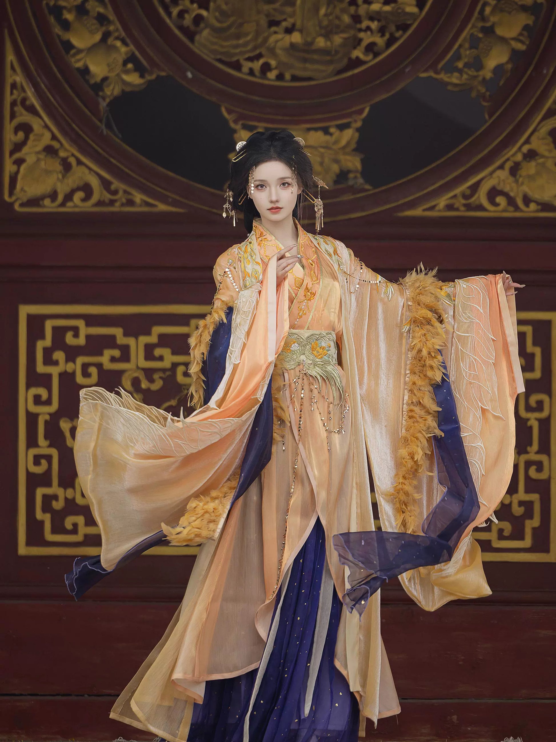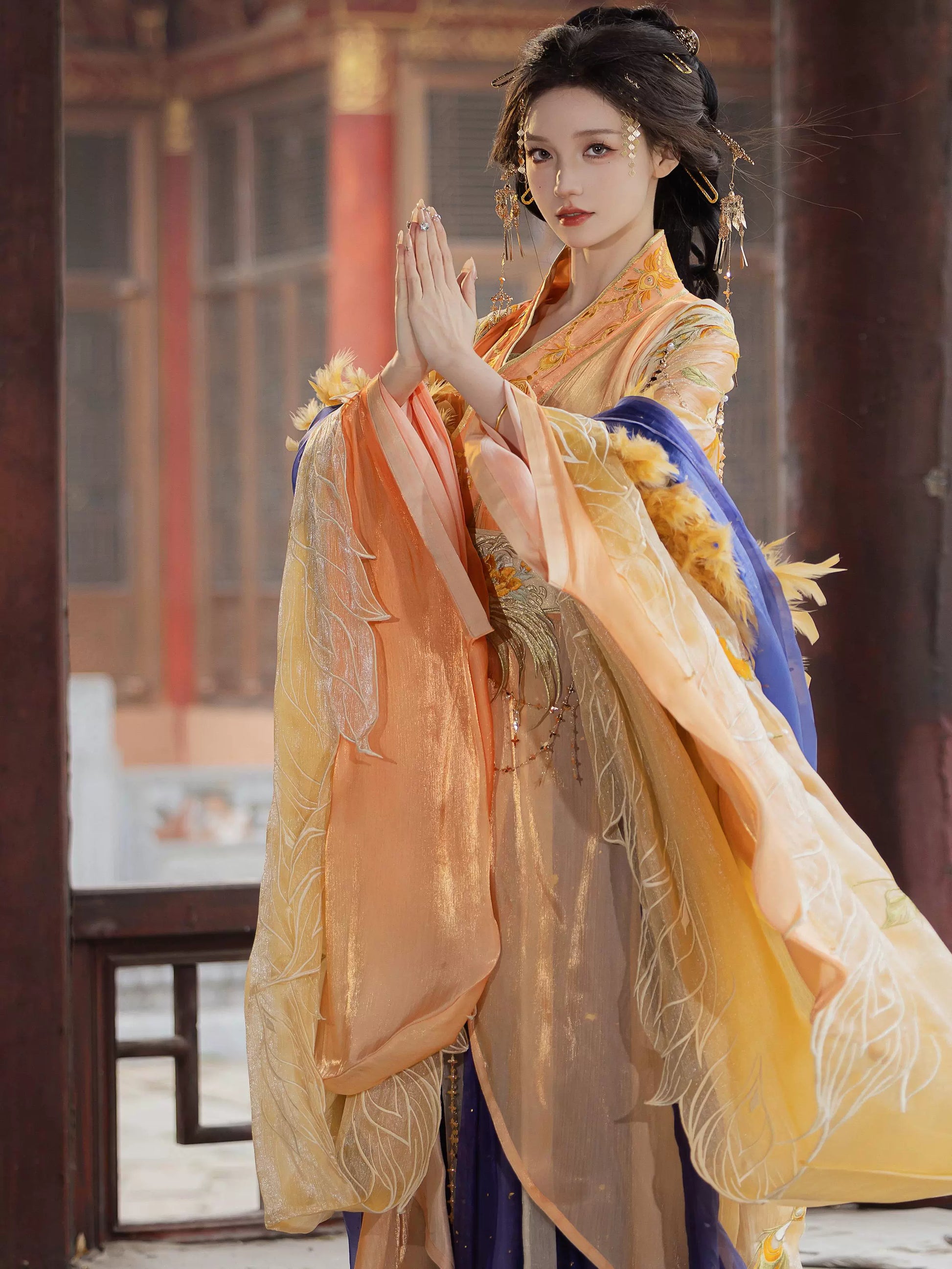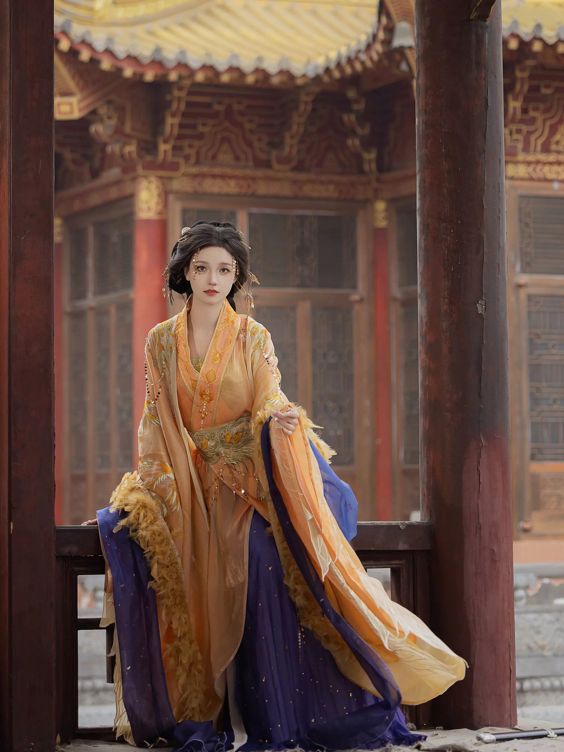 "Imagine: The whisper of silk as you stroll through autumn gardens, sleeves flowing like poetry in motion. This is the 'Vermilion Heritage Atelier' experience—where every thread tells a story."
