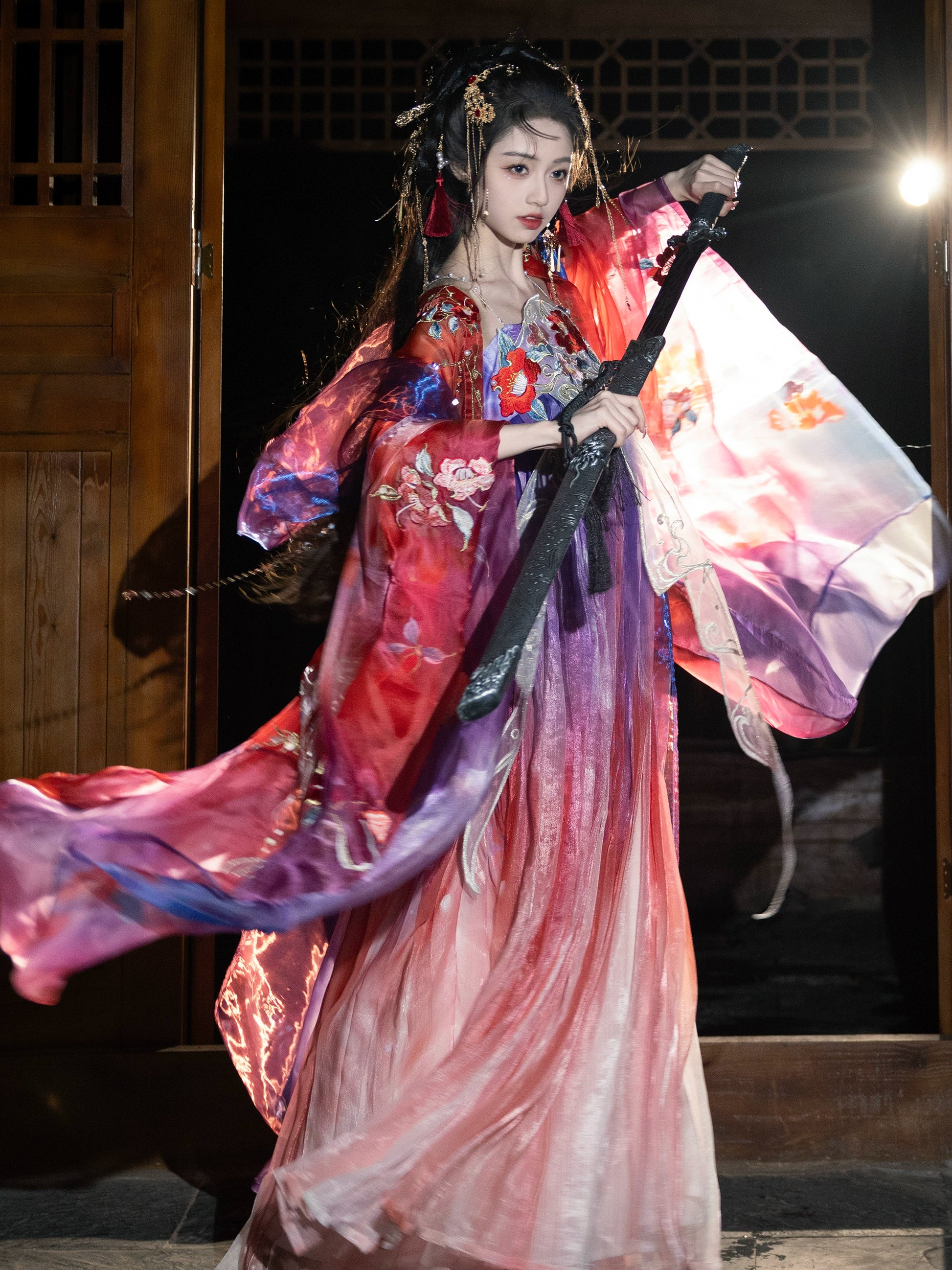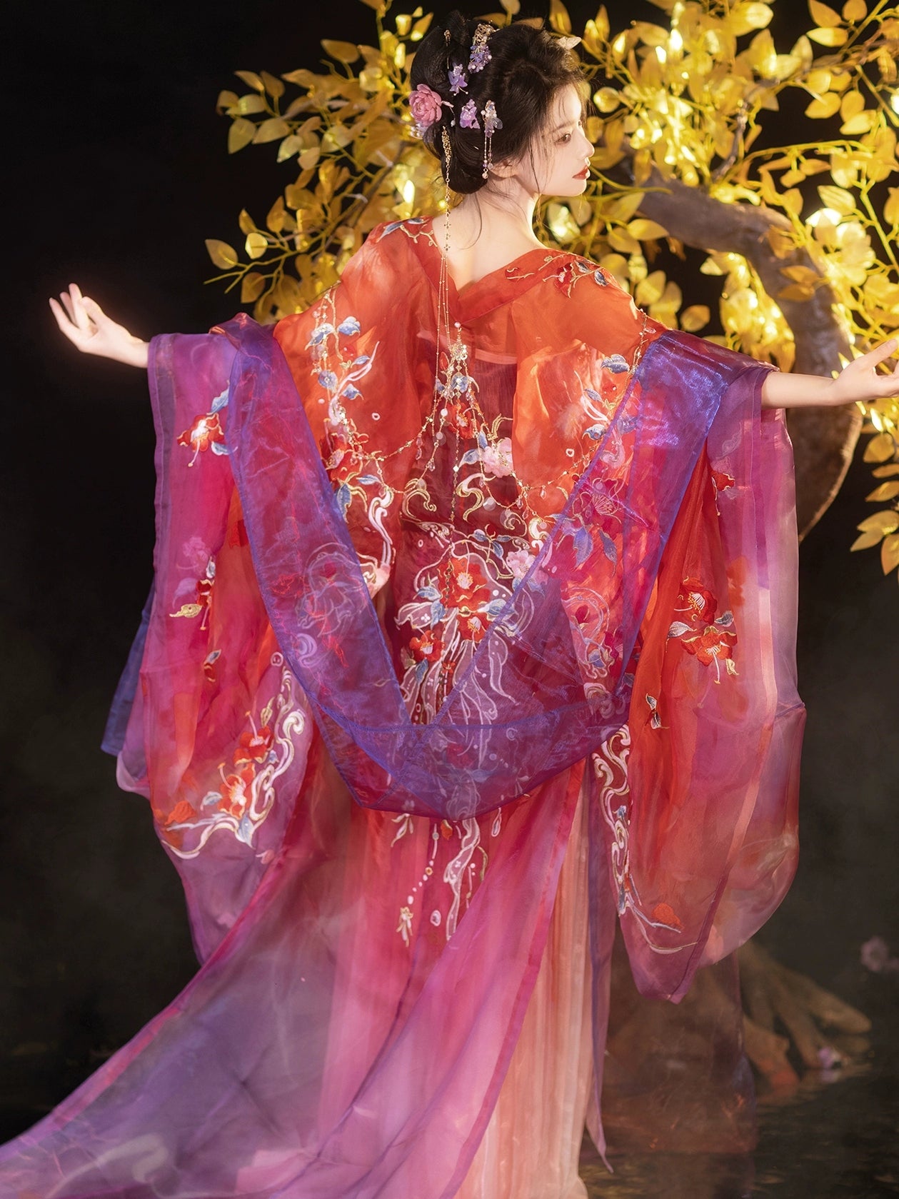 "Imagine: The whisper of silk as you stroll through autumn gardens, sleeves flowing like poetry in motion. This is the 'Vermilion Heritage Atelier' experience—where every thread tells a story."
