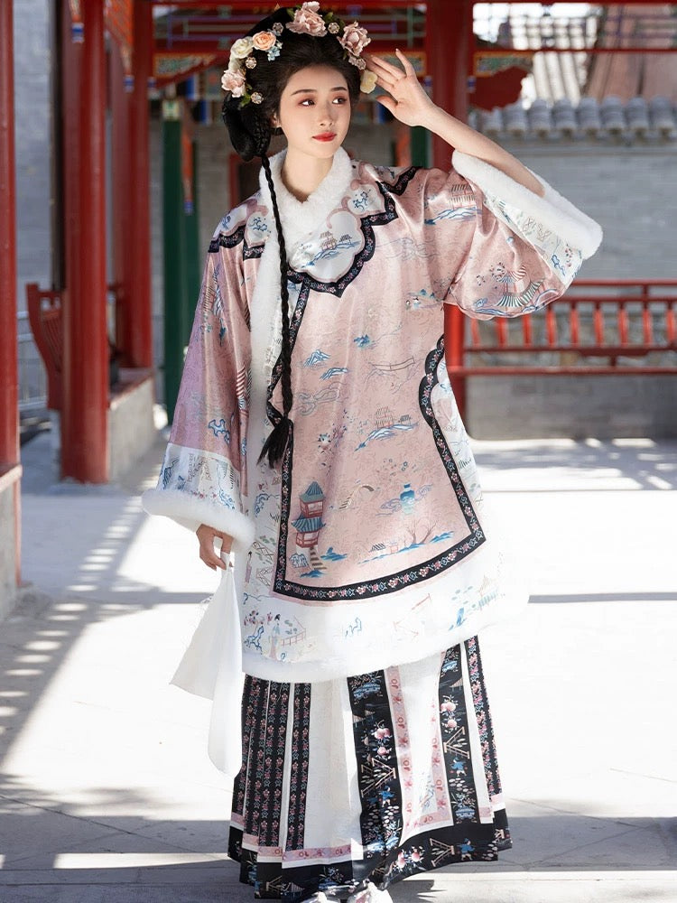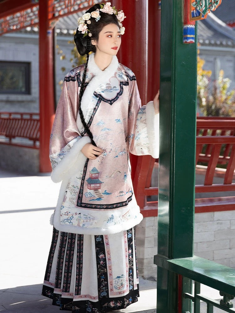 女性のための冬の漢服アンサンブルで、清朝の優雅な雰囲気に足を踏み入れてください。この絶妙な衣装は、清時代を思い出させる複雑なプリントで飾られたクロスカラーのアンティーク衣装を特徴としています。美しい馬の顔の刺繍が施されたスカートが服装を引き立て、冬のワードローブに洗練されたタッチを加えています。