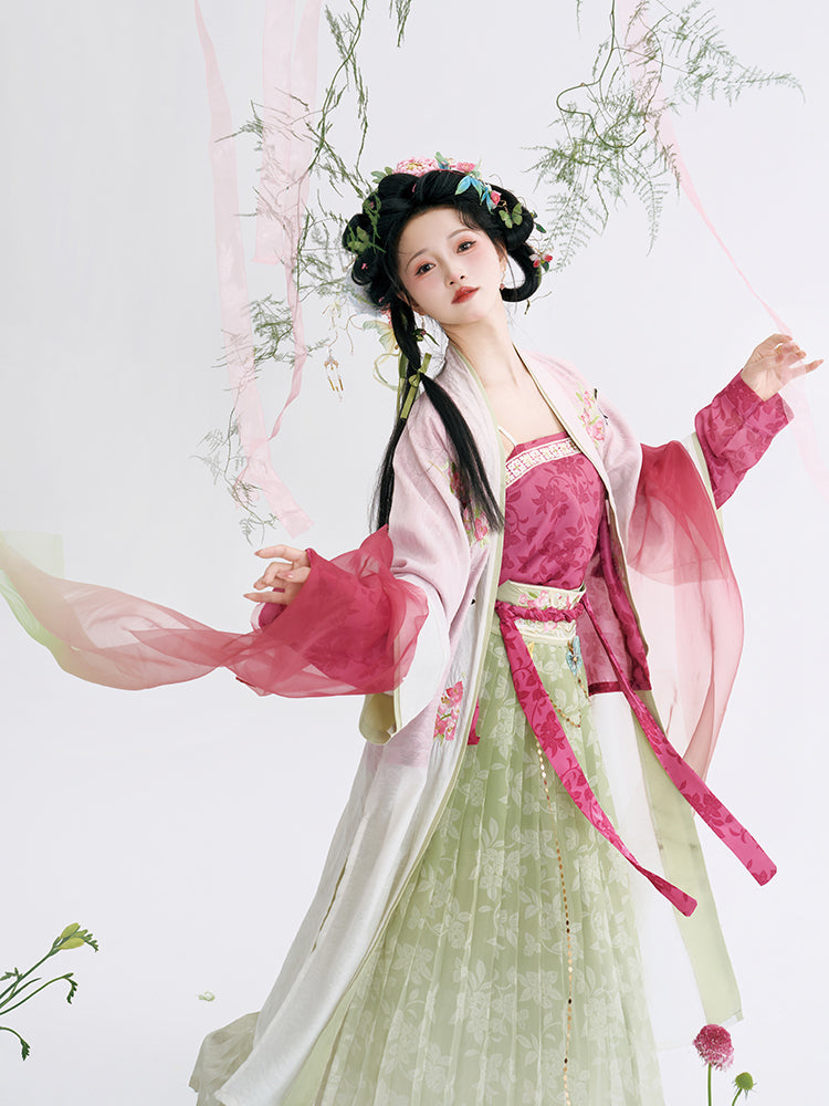 Hanfu, the traditional attire of the Han Chinese people, boasts a rich historical and cultural heritage along with unique aesthetic values. Characterized by its crossed collars, right-overlapping fronts, and tied belts, Hanfu exudes an elegant and flowing charm. It comes in various forms, including tops and skirts, one-piece robes, and tunic dresses, catering to both formal and casual occasions.