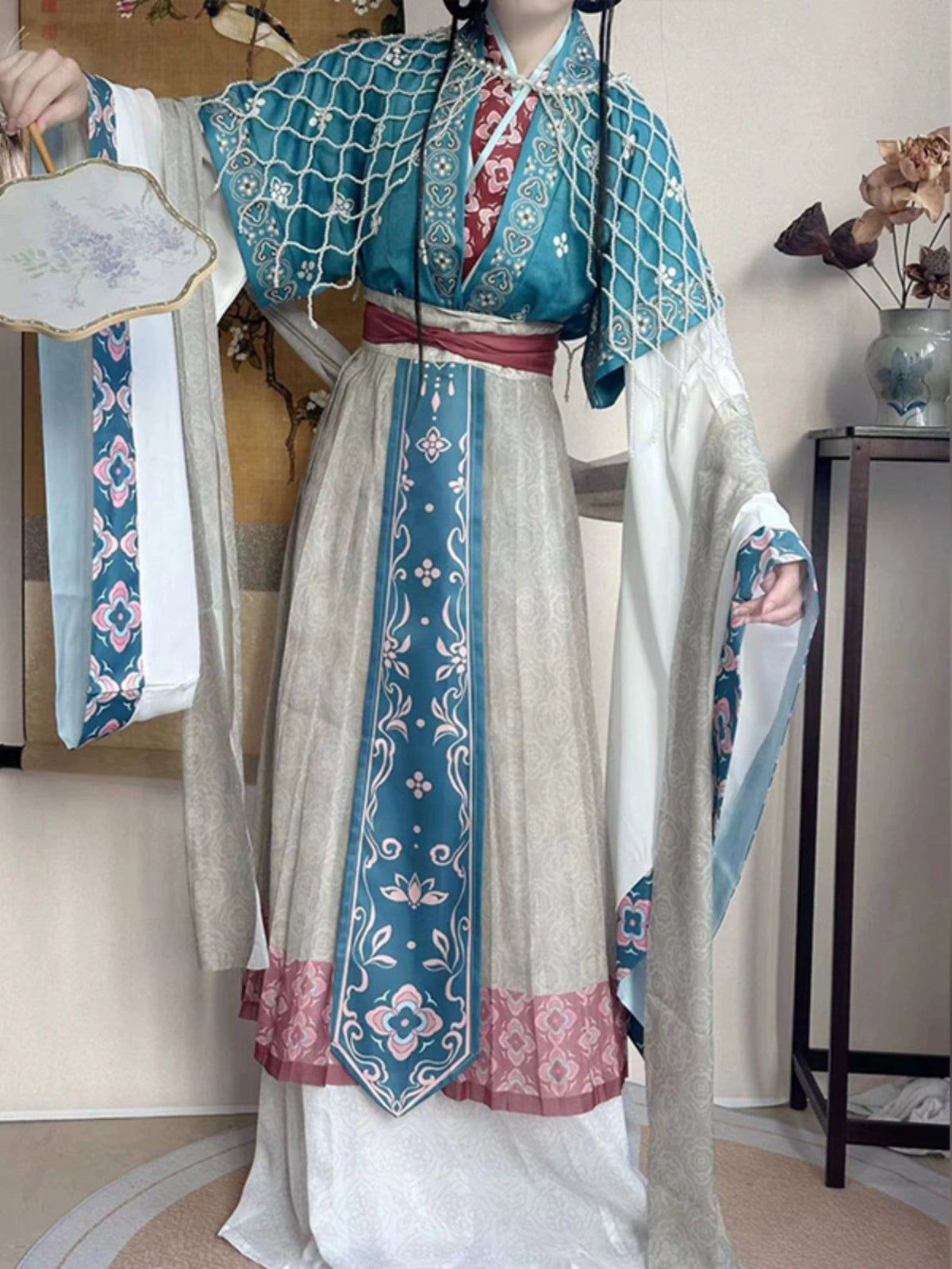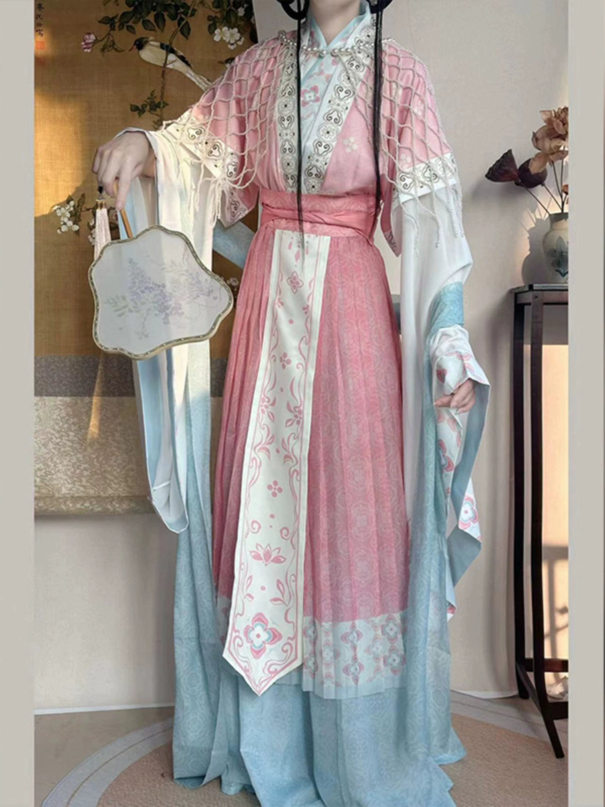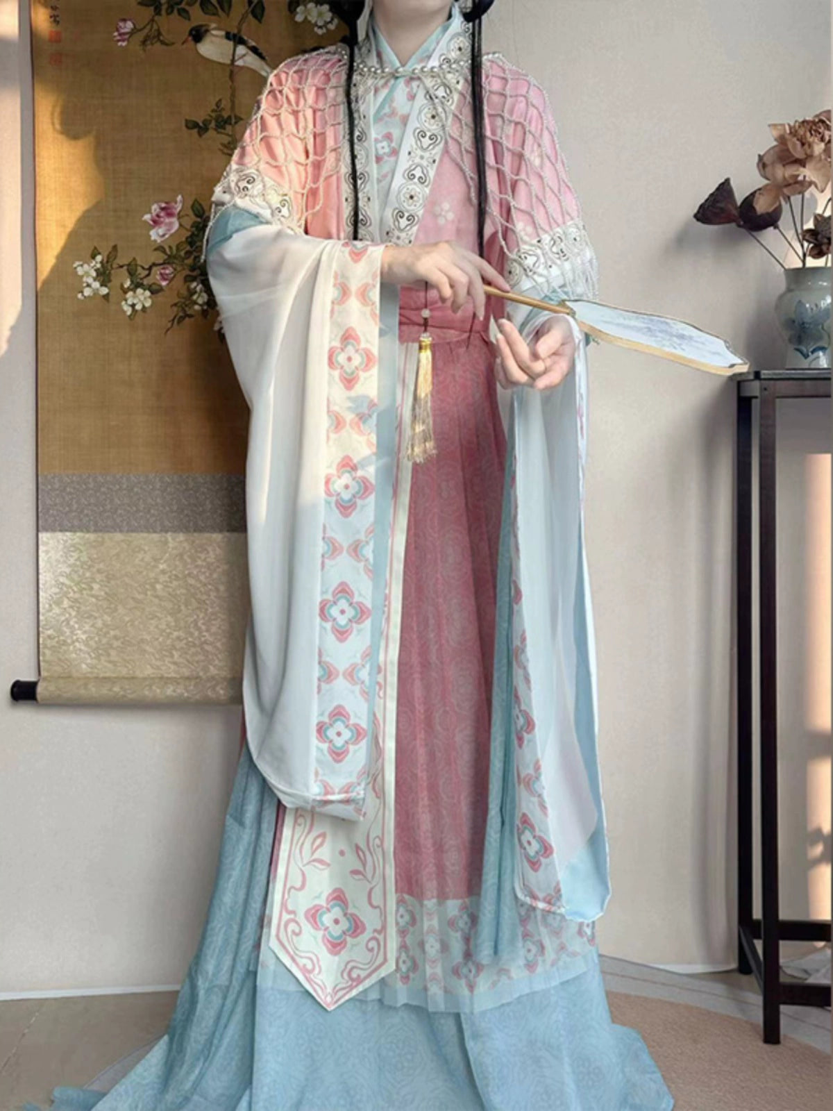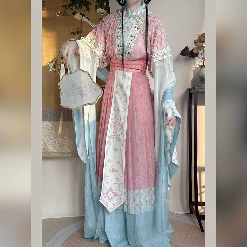 HANFU seven-piece set:Outer large sleeves + inner large sleeves + ripped skirt + apron + floating piece + shawl + scarf