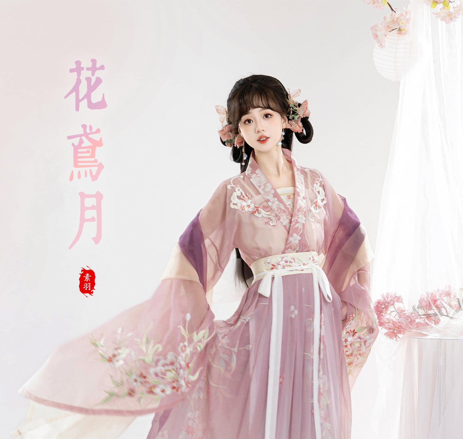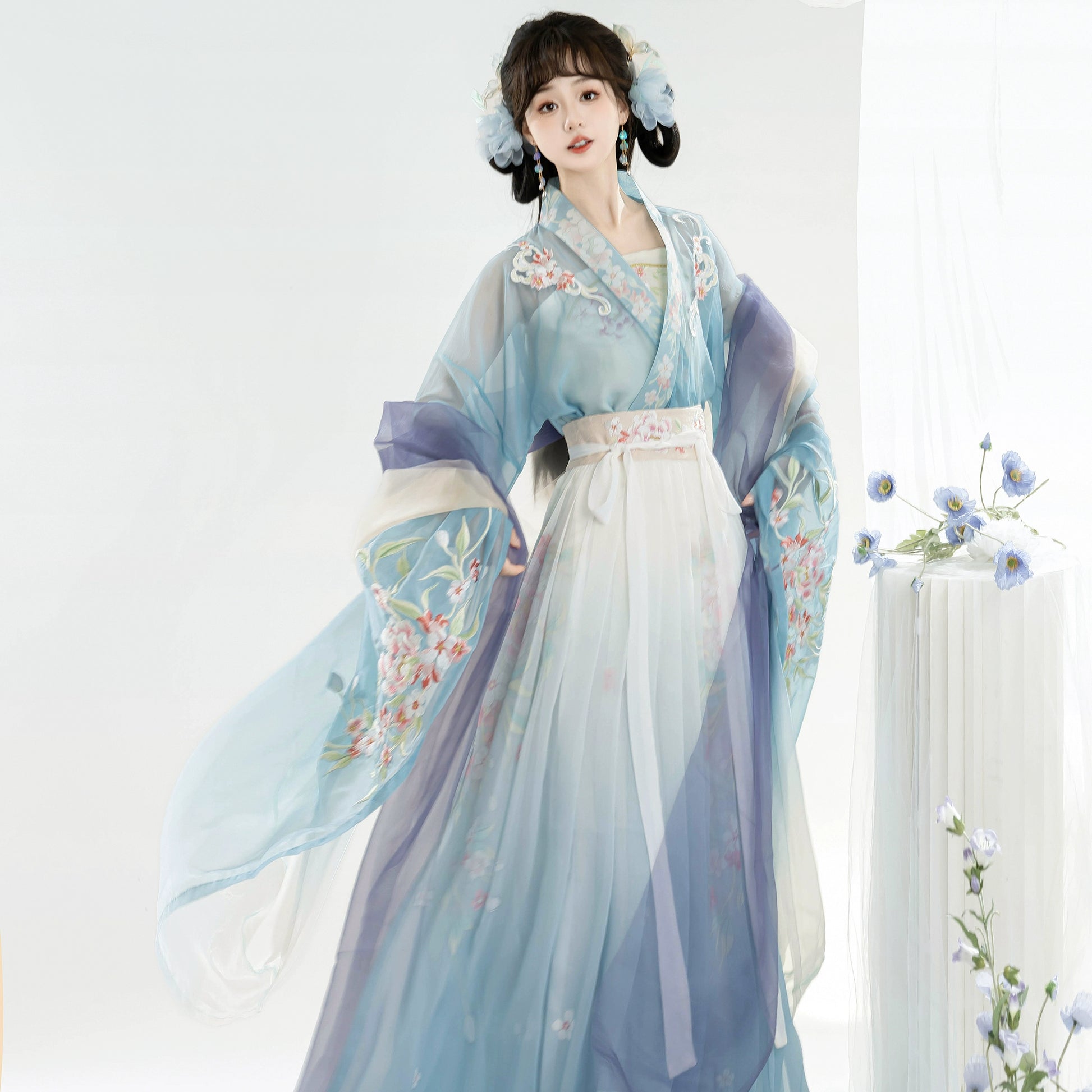 Hanfu, the traditional attire of the Han Chinese people, boasts a rich historical and cultural heritage along with unique aesthetic values. Characterized by its crossed collars, right-overlapping fronts, and tied belts, Hanfu exudes an elegant and flowing charm. It comes in various forms, including tops and skirts, one-piece robes, and tunic dresses, catering to both formal and casual occasions.