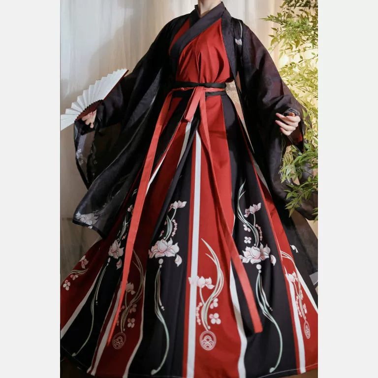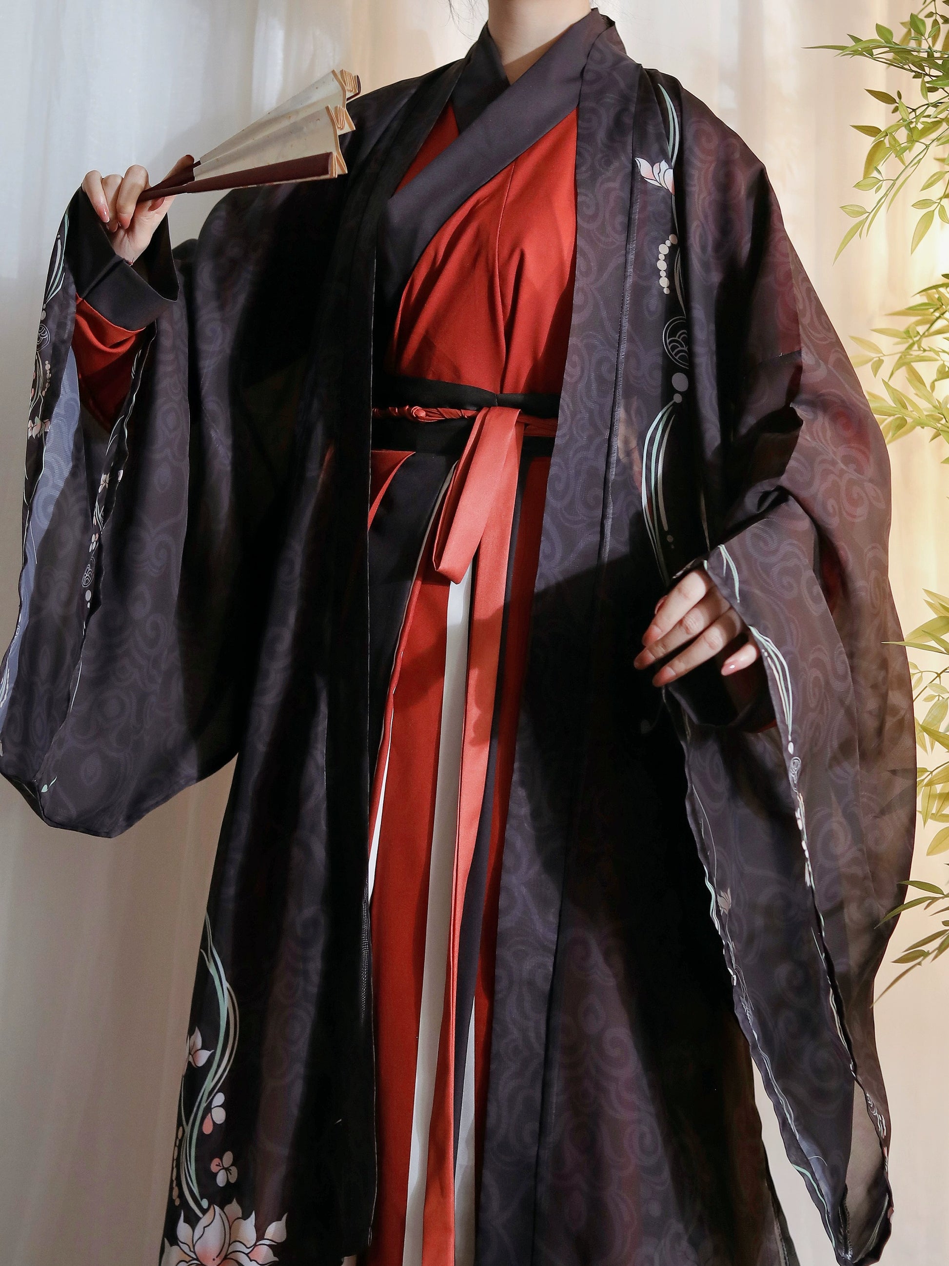 Men'S Hanfu Wei-Jin Style Black Red Long Sleeve Shirt