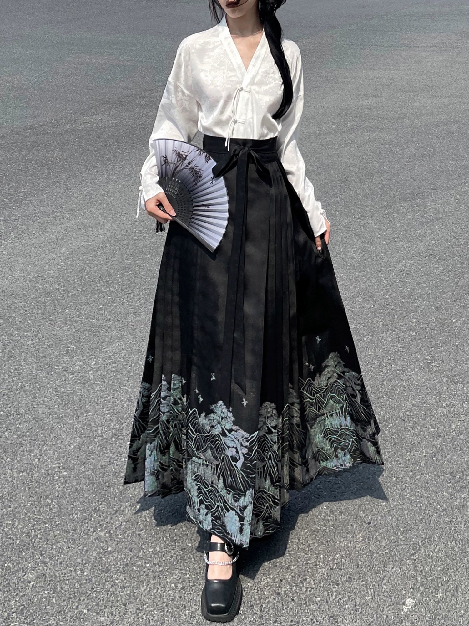 Step into the modern elegance of New Chinese Style with our Black & White Shirt Women's Horse Face Skirt Suit. This ensemble captures the essence of traditional Hanfu design with a contemporary twist. The horse face skirt pays homage to the ancient origins of Hanfu, featuring intricate embroidery that adds a touch of authenticity to your look. Learn the art of wrapping and tying the Hanfu skirt, following time-honored techniques passed down through generations. Explore our collection of modern Hanfu designs, featuring exquisite embroidery and elegant details, perfect for any occasion. Embrace the timeless beauty of Hanfu fashion and make a statement with your unique sense of style.Processing Time: 15 days