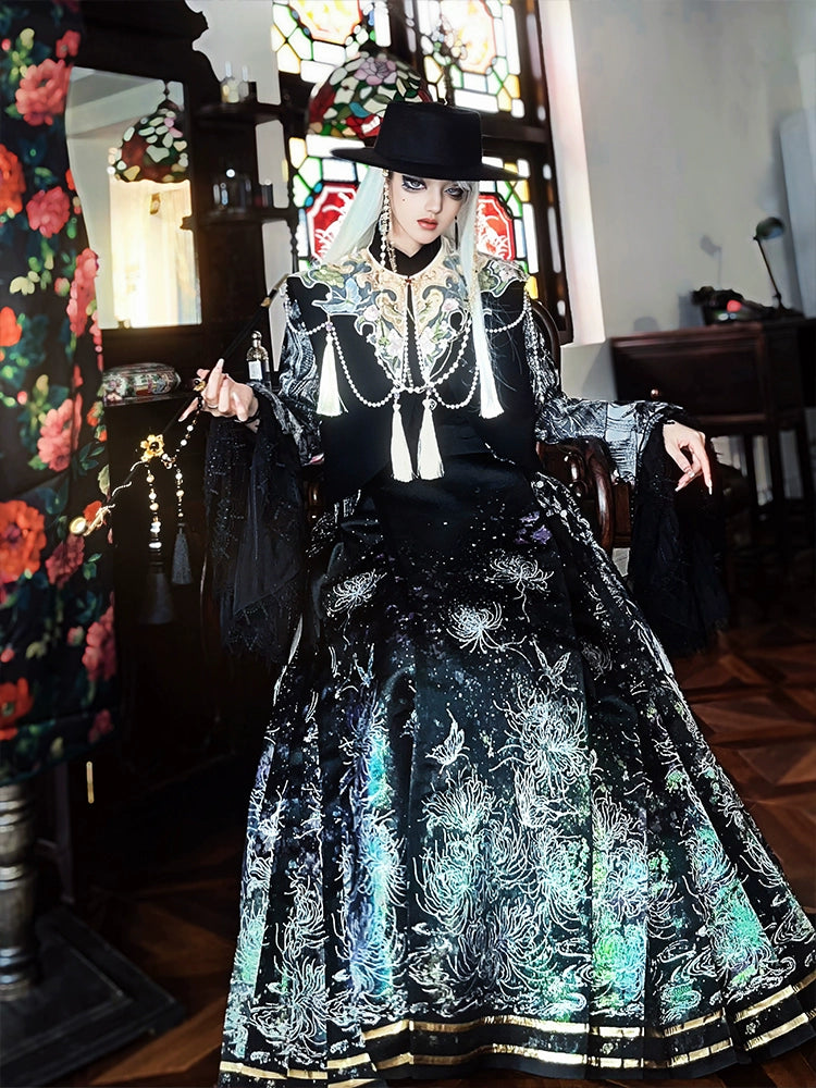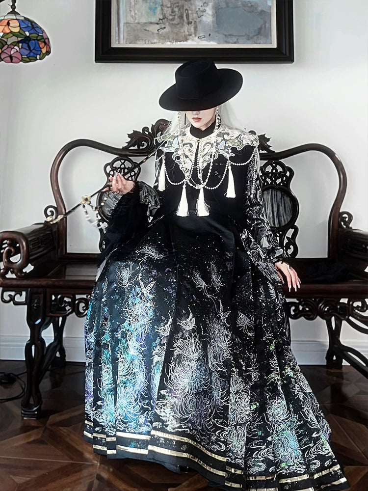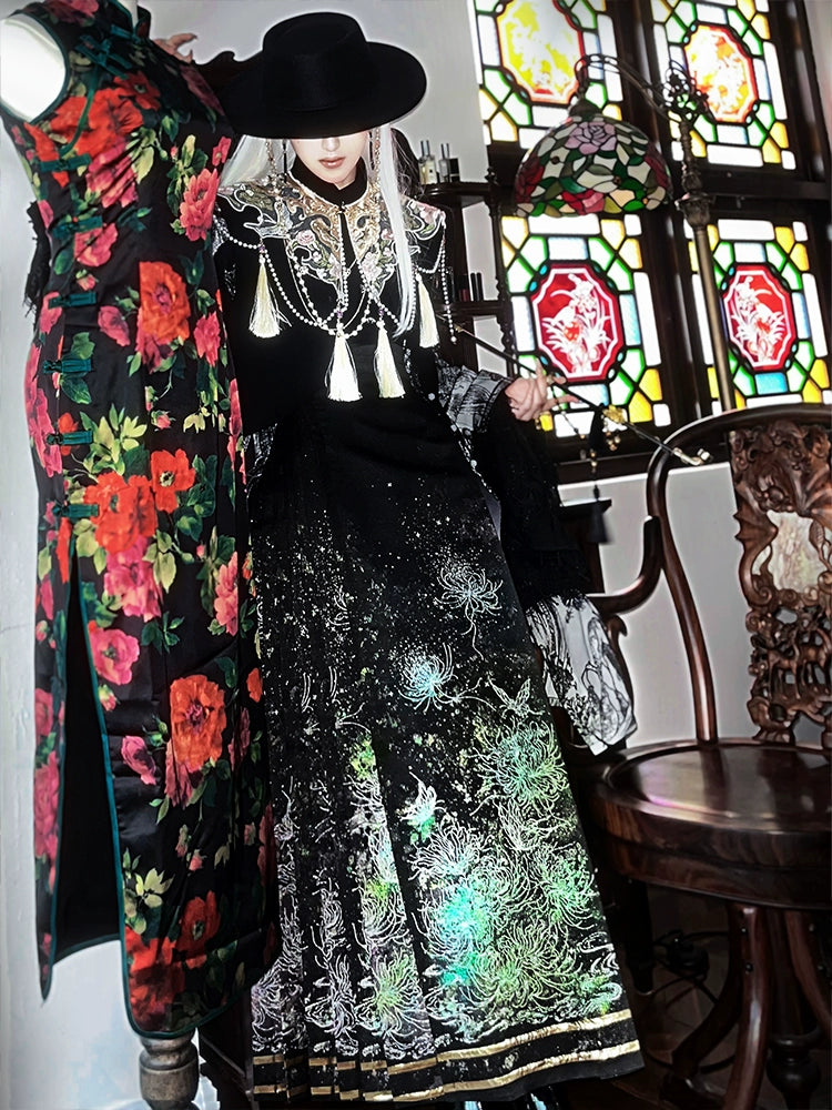 "Silk Road Reverie: Hanfu's Odyssey Through Ethnic Kaleidoscope", your fingers trace the Tang Dynasty roundel-patterned robe, suddenly discovering Sogdian ciphertext hidden in the sleeves—this is the original "Huxuan Dance Gown" An Lushan presented to Yang Guifei, the Persian craftsman whispers, "The lotus paste in this mooncake hides a Sogdian map... Follow the cumin-scented threads." When your gold-sprinkled silk shawl touches the artist's yak-hair brush, Tibetan script from the "Tubo Alliance Stele" emerges, "When Princess Wencheng's silk skirts met Tibetan wool, the Yarlung Tsangpo turned to liquid damask." Under UV light, hemline reveals Guge Kingdom mandala paintings. A Khotanese muralist tugs your sash, "Your 'lion motif' is actually our 'pomegranate dance pattern'!" Hanfu's jia xie resist-dyeing shares roots with Uyghur abrabandi tie-dye. A saukele headdress artisan transforms your bronze belt into modular instruments, left hook holding a Mongolian tovshuur lute, right loop carrying a Tajik eagle-bone flute, centerpiece displaying Xianbei gilded horse ornament, metal components auto-playing Kuchean-Twelve Muqam fusion under full moon. Under grapevines, a Ningxia embroiderer gasps at your "mountain-wave" pattern, "These 'peaks' mirror Helan Mountains, the 'surges' recreate Yellow River eddies!" Pleats woven with Tangut "Pearl in Palm" fragments become scannable with phones. As the Kyrgyz shaman's drum echoes, your composite-flower motifs morph into Yi solar calendar constellations, Khitan death mask filigree, Jurchen sea-eagle feather iridescence, unbuttoning the collar reveals Genghis Khan's multilingual travel permit. QR codes reveal 22 ethnic groups' textile DNA, body heat releases cinnamon/saffron scent capsules, sleeves extend into Mongolian wrestling sashes, each label includes Yi shaman-blessed silver plaque, Zhuang bronze drum soundwave QR, Evenki reindeer tendon thread sample. The capsule collection features Qinghai yak-down woven into Tang transparent-back gauze lined with Yangbajing geothermal film, Xianbei saddle-shaped girdle detaching into Kazakh dombra, Li barkcloth combined with Minnan mermaid silk revealing Zheng He's nautical charts when wet—"This isn't clothing—it's a UNESCO site you can wear to brunch." The cultural codex spans Dai palm-leaf sutra patterns thermo-chromically displaying Water Festival blessings, She mountain songs powering LEDs through friction, Hezhe fish-skin seams GPS-tagging Amur fishing seasons, inviting deeper exploration of Qiang watchtower stone patterns or Daur hockey elements fused with Tang polo robes.