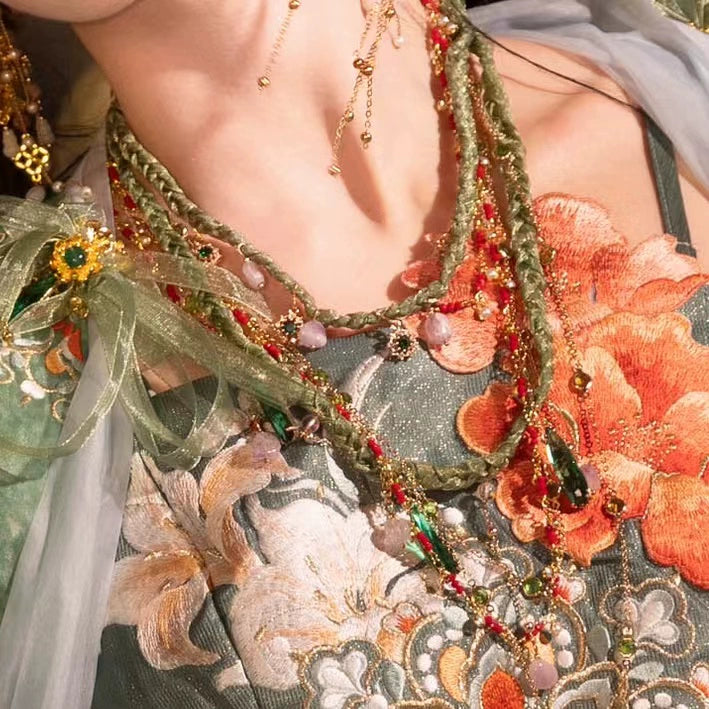 "Silk Road Reverie: Hanfu's Odyssey Through Ethnic Kaleidoscope", your fingers trace the Tang Dynasty roundel-patterned robe, suddenly discovering Sogdian ciphertext hidden in the sleeves—this is the original "Huxuan Dance Gown" An Lushan presented to Yang Guifei, the Persian craftsman whispers, "The lotus paste in this mooncake hides a Sogdian map... Follow the cumin-scented threads." When your gold-sprinkled silk shawl touches the artist's yak-hair brush, Tibetan script from the "Tubo Alliance Stele" emerges, "When Princess Wencheng's silk skirts met Tibetan wool, the Yarlung Tsangpo turned to liquid damask." Under UV light, hemline reveals Guge Kingdom mandala paintings. A Khotanese muralist tugs your sash, "Your 'lion motif' is actually our 'pomegranate dance pattern'!" Hanfu's jia xie resist-dyeing shares roots with Uyghur abrabandi tie-dye. A saukele headdress artisan transforms your bronze belt into modular instruments, left hook holding a Mongolian tovshuur lute, right loop carrying a Tajik eagle-bone flute, centerpiece displaying Xianbei gilded horse ornament, metal components auto-playing Kuchean-Twelve Muqam fusion under full moon. Under grapevines, a Ningxia embroiderer gasps at your "mountain-wave" pattern, "These 'peaks' mirror Helan Mountains, the 'surges' recreate Yellow River eddies!" Pleats woven with Tangut "Pearl in Palm" fragments become scannable with phones. As the Kyrgyz shaman's drum echoes, your composite-flower motifs morph into Yi solar calendar constellations, Khitan death mask filigree, Jurchen sea-eagle feather iridescence, unbuttoning the collar reveals Genghis Khan's multilingual travel permit. QR codes reveal 22 ethnic groups' textile DNA, body heat releases cinnamon/saffron scent capsules, sleeves extend into Mongolian wrestling sashes, each label includes Yi shaman-blessed silver plaque, Zhuang bronze drum soundwave QR, Evenki reindeer tendon thread sample. The capsule collection features Qinghai yak-down woven into Tang transparent-back gauze lined with Yangbajing geothermal film, Xianbei saddle-shaped girdle detaching into Kazakh dombra, Li barkcloth combined with Minnan mermaid silk revealing Zheng He's nautical charts when wet—"This isn't clothing—it's a UNESCO site you can wear to brunch." The cultural codex spans Dai palm-leaf sutra patterns thermo-chromically displaying Water Festival blessings, She mountain songs powering LEDs through friction, Hezhe fish-skin seams GPS-tagging Amur fishing seasons, inviting deeper exploration of Qiang watchtower stone patterns or Daur hockey elements fused with Tang polo robes.