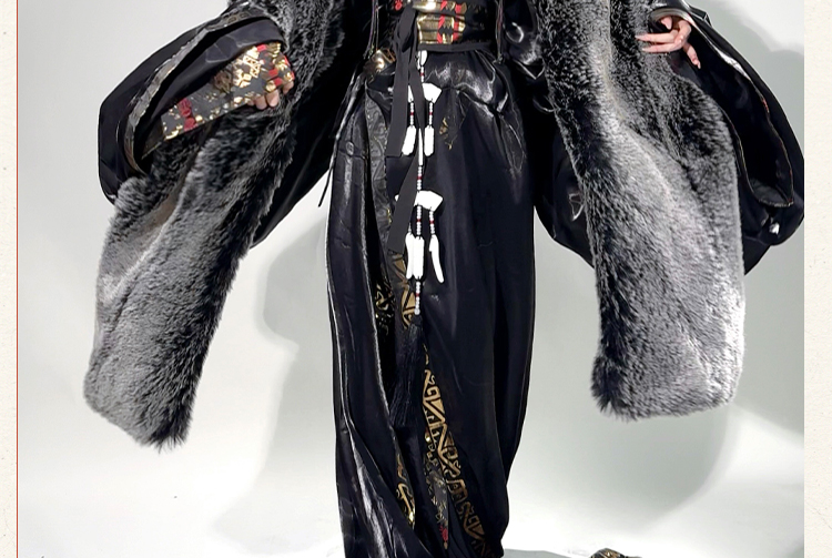 "Silk Road Reverie: Hanfu's Odyssey Through Ethnic Kaleidoscope", your fingers trace the Tang Dynasty roundel-patterned robe, suddenly discovering Sogdian ciphertext hidden in the sleeves—this is the original "Huxuan Dance Gown" An Lushan presented to Yang Guifei, the Persian craftsman whispers, "The lotus paste in this mooncake hides a Sogdian map... Follow the cumin-scented threads." When your gold-sprinkled silk shawl touches the artist's yak-hair brush, Tibetan script from the "Tubo Alliance Stele" emerges, "When Princess Wencheng's silk skirts met Tibetan wool, the Yarlung Tsangpo turned to liquid damask." Under UV light, hemline reveals Guge Kingdom mandala paintings. A Khotanese muralist tugs your sash, "Your 'lion motif' is actually our 'pomegranate dance pattern'!" Hanfu's jia xie resist-dyeing shares roots with Uyghur abrabandi tie-dye. A saukele headdress artisan transforms your bronze belt into modular instruments, left hook holding a Mongolian tovshuur lute, right loop carrying a Tajik eagle-bone flute, centerpiece displaying Xianbei gilded horse ornament, metal components auto-playing Kuchean-Twelve Muqam fusion under full moon. Under grapevines, a Ningxia embroiderer gasps at your "mountain-wave" pattern, "These 'peaks' mirror Helan Mountains, the 'surges' recreate Yellow River eddies!" Pleats woven with Tangut "Pearl in Palm" fragments become scannable with phones. As the Kyrgyz shaman's drum echoes, your composite-flower motifs morph into Yi solar calendar constellations, Khitan death mask filigree, Jurchen sea-eagle feather iridescence, unbuttoning the collar reveals Genghis Khan's multilingual travel permit. QR codes reveal 22 ethnic groups' textile DNA, body heat releases cinnamon/saffron scent capsules, sleeves extend into Mongolian wrestling sashes, each label includes Yi shaman-blessed silver plaque, Zhuang bronze drum soundwave QR, Evenki reindeer tendon thread sample. The capsule collection features Qinghai yak-down woven into Tang transparent-back gauze lined with Yangbajing geothermal film, Xianbei saddle-shaped girdle detaching into Kazakh dombra, Li barkcloth combined with Minnan mermaid silk revealing Zheng He's nautical charts when wet—"This isn't clothing—it's a UNESCO site you can wear to brunch." The cultural codex spans Dai palm-leaf sutra patterns thermo-chromically displaying Water Festival blessings, She mountain songs powering LEDs through friction, Hezhe fish-skin seams GPS-tagging Amur fishing seasons, inviting deeper exploration of Qiang watchtower stone patterns or Daur hockey elements fused with Tang polo robes.