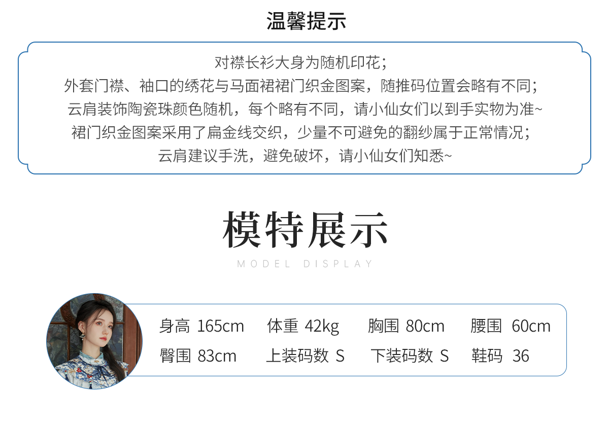 Hanfu is a handmade product, not a mass-produced product in a garment factory. In theory, there are no two completely identical Hanfu. The product details page only shows the shape of this Hanfu, especially the embroidery on the Hanfu. It is impossible for tailors to make it 100% the same. Consumers who cannot accept this please do not buy it